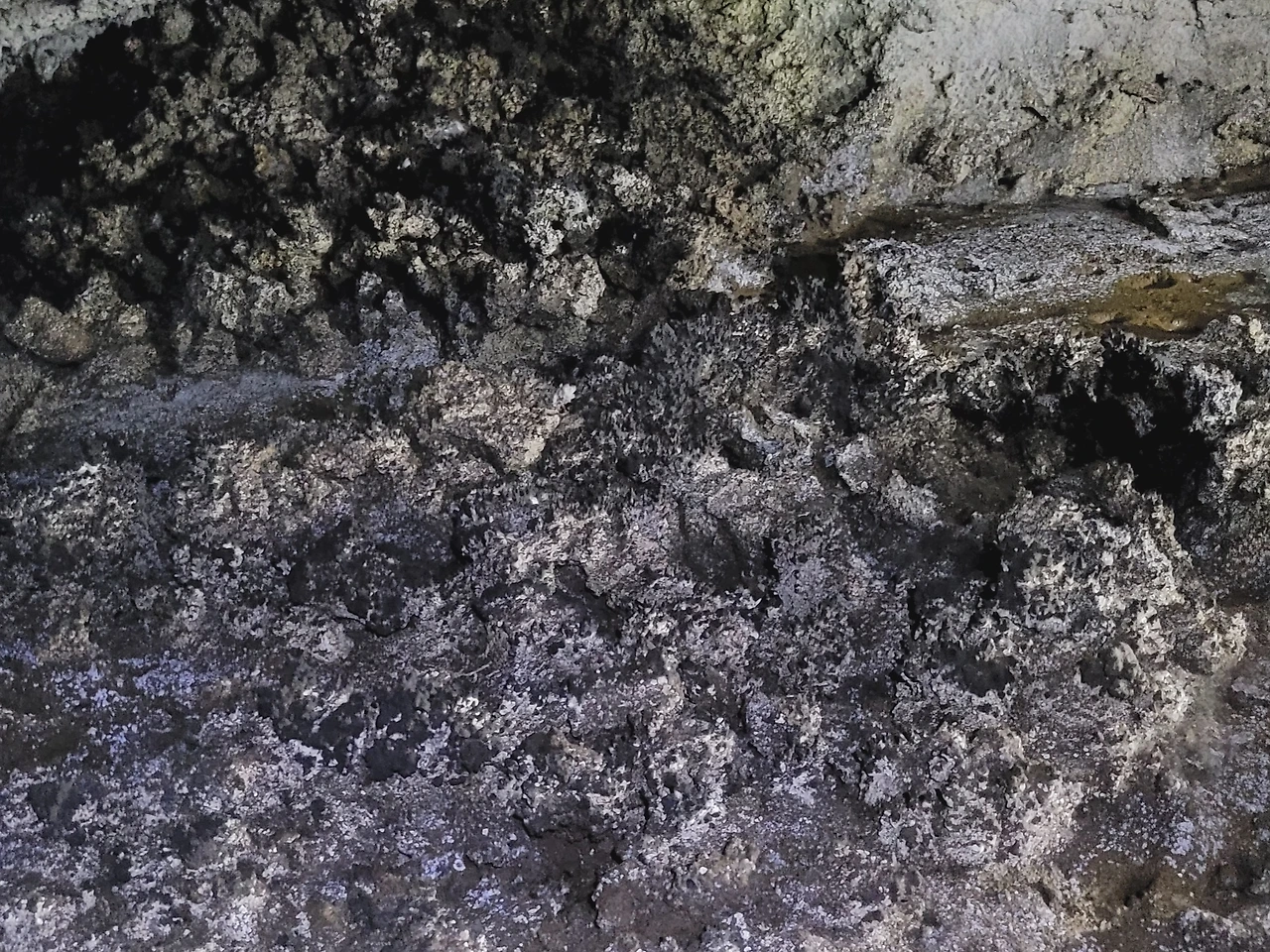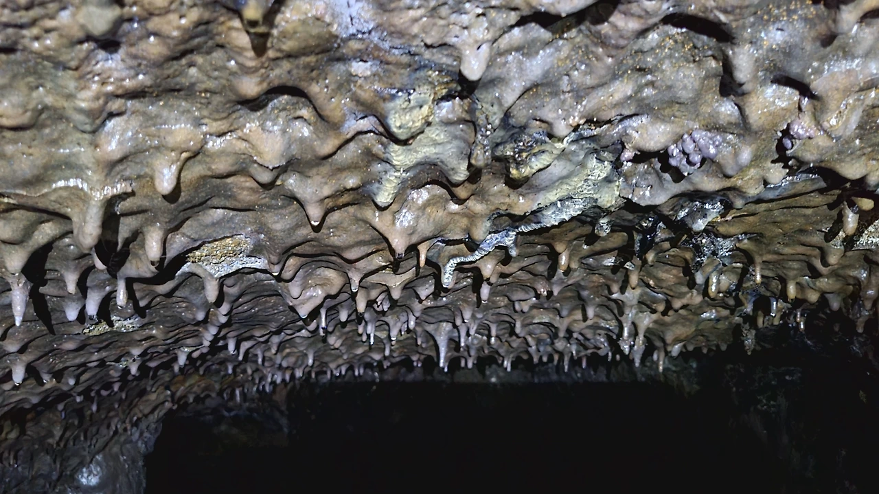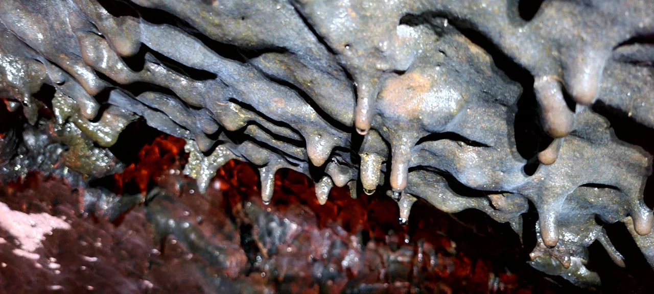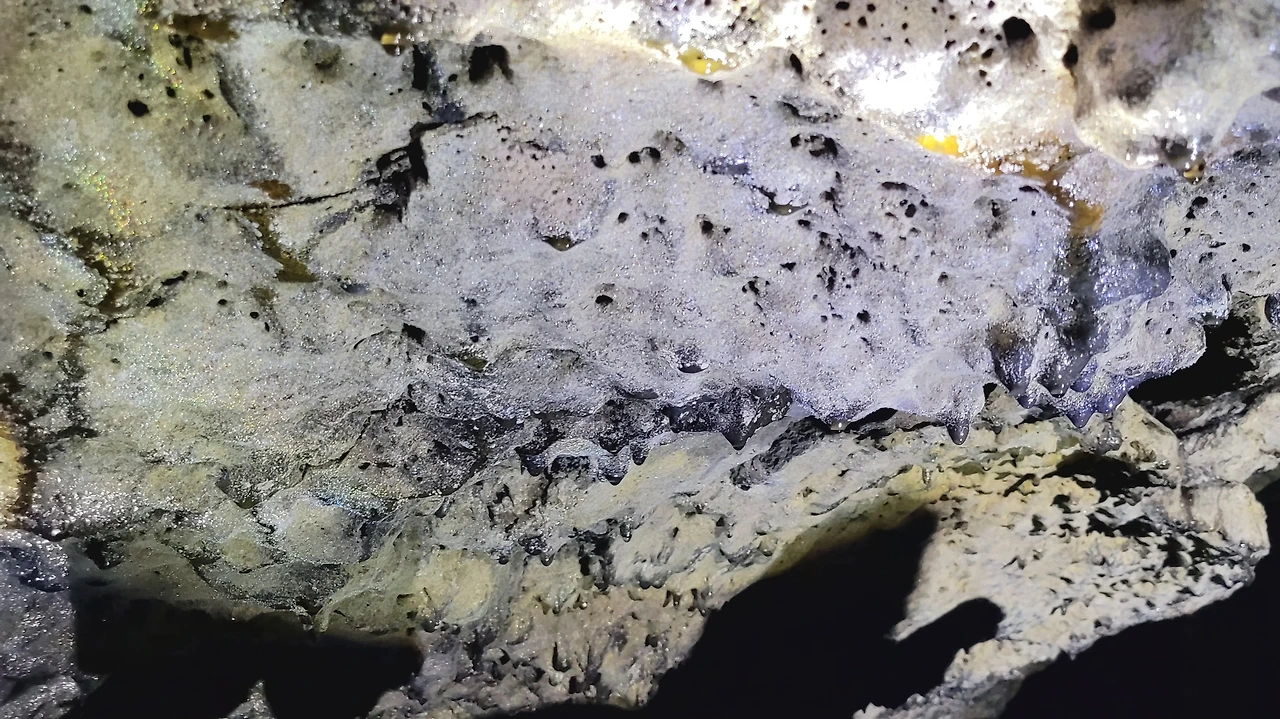 박테리아. 벵뒤굴 천장과 벽면에 오랜 세월을 지나며 형성된 박테리아층이 분포되어 있다. 살짝 접촉해도 훼손될 수 있다.