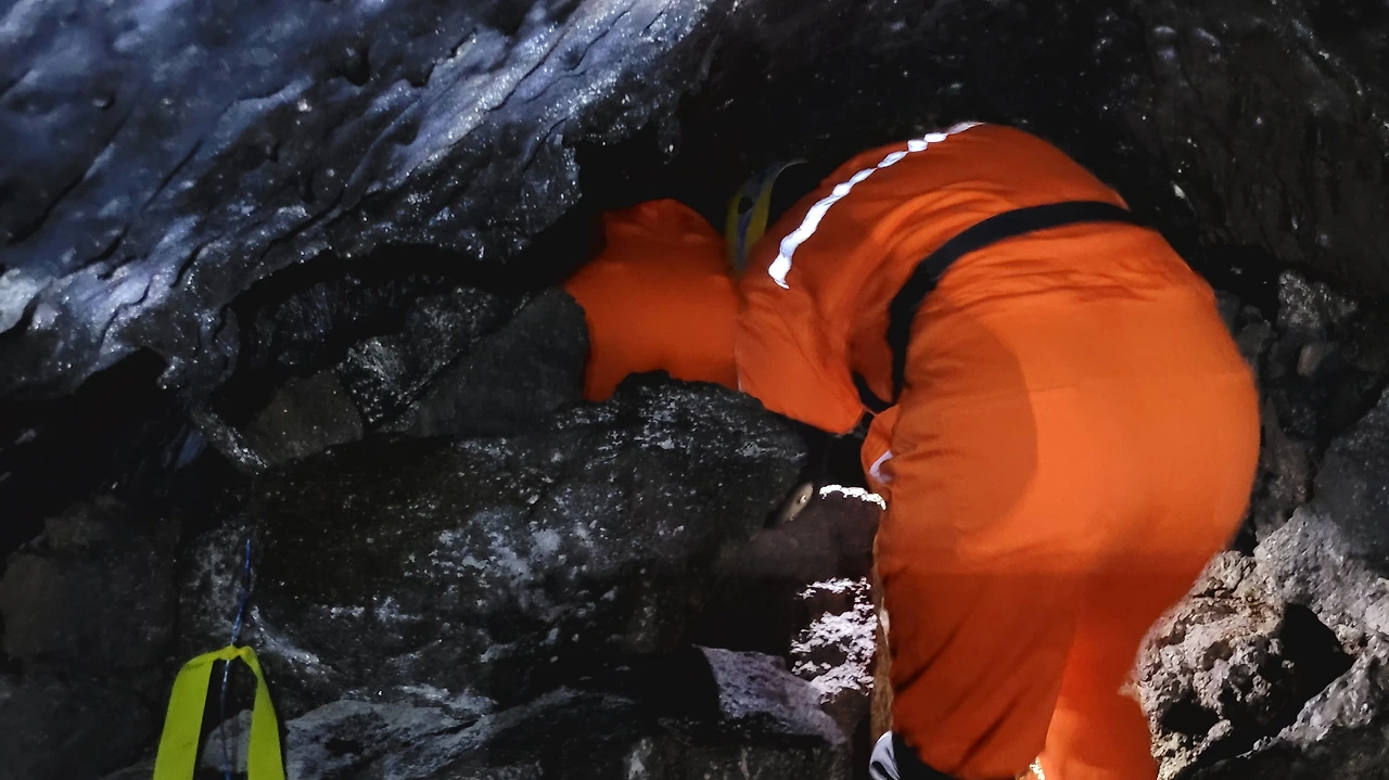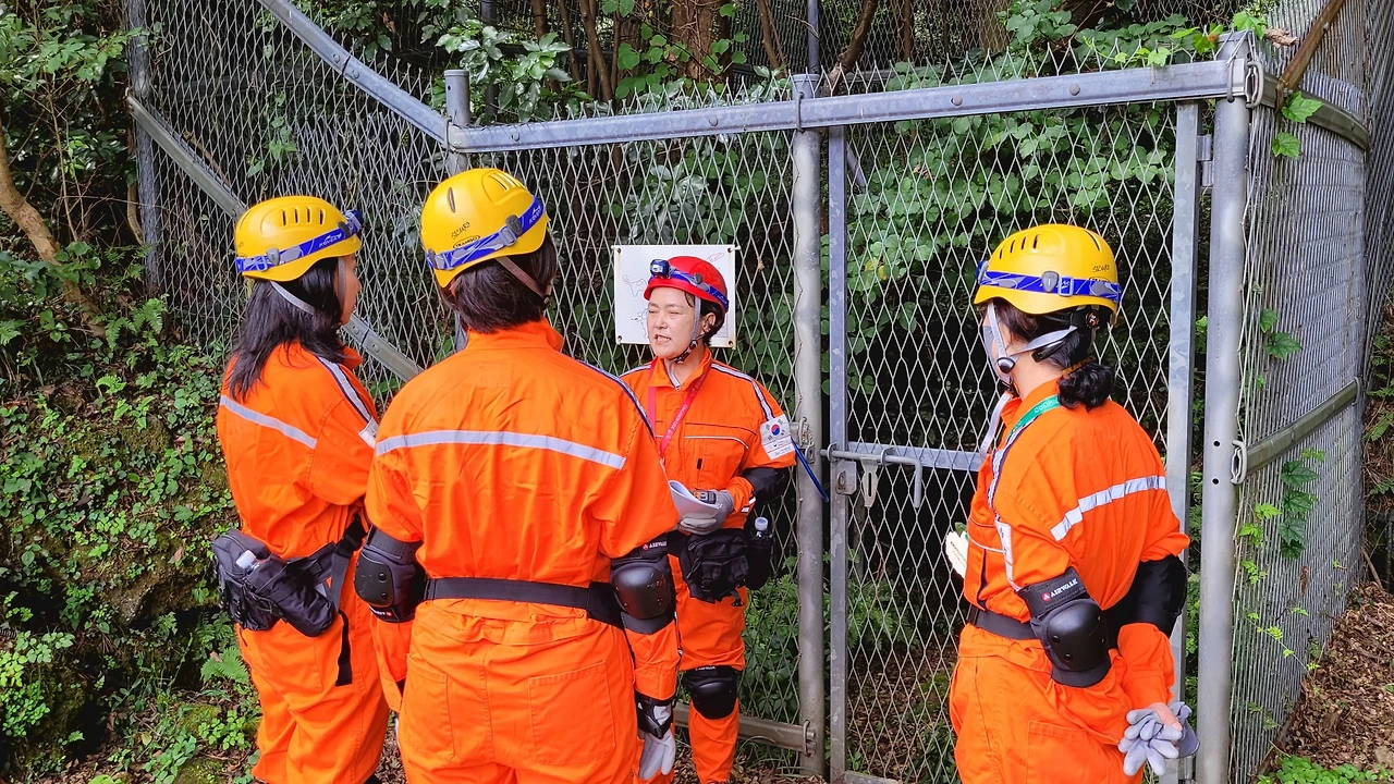 좁은 공간을 기어서 통과한다. 한 사람 겨우 통과할 수 있는 공간이다. 허리를 굽혀야 되는 공간과 무릎으로 기어야되는 공간이 이어진다. 무릎, 팔목, 손가락 보호대와 헬멧, 장갑을 착용한 이유를 알겠다.