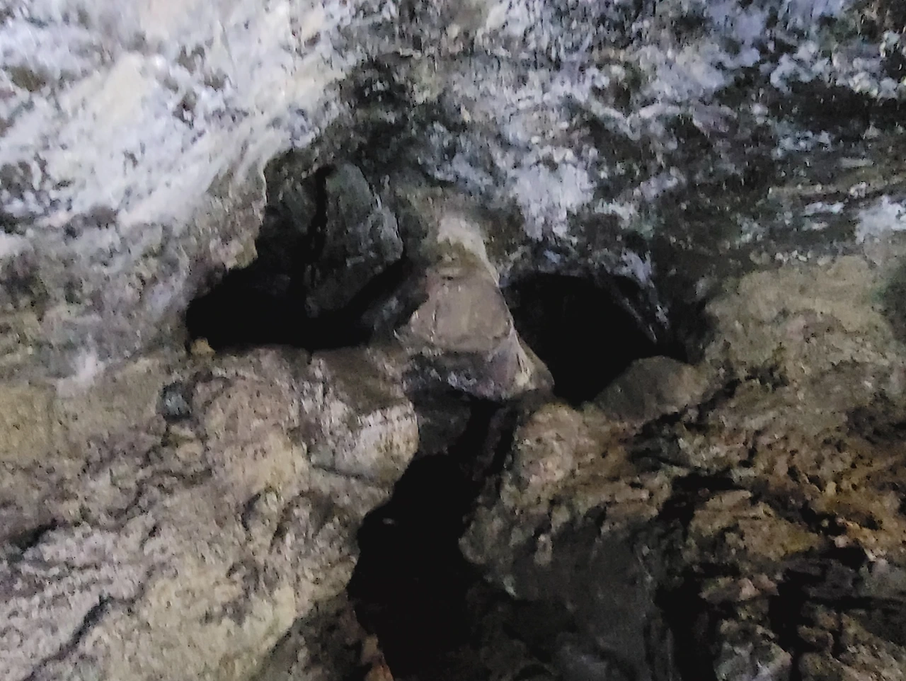 종유석. 통로가 좁아지는 구역의 천장에서 주로 발견된다. 동굴 내부로 흐르는 용암의 열 때문에 천장의 표면이 부분적으로 녹아내려 생긴 동굴생성물이다. 탐사대가 동굴 벽면을 살피며 조심스럽게 이동하지만 자꾸 머리로 천장을 건드린다.