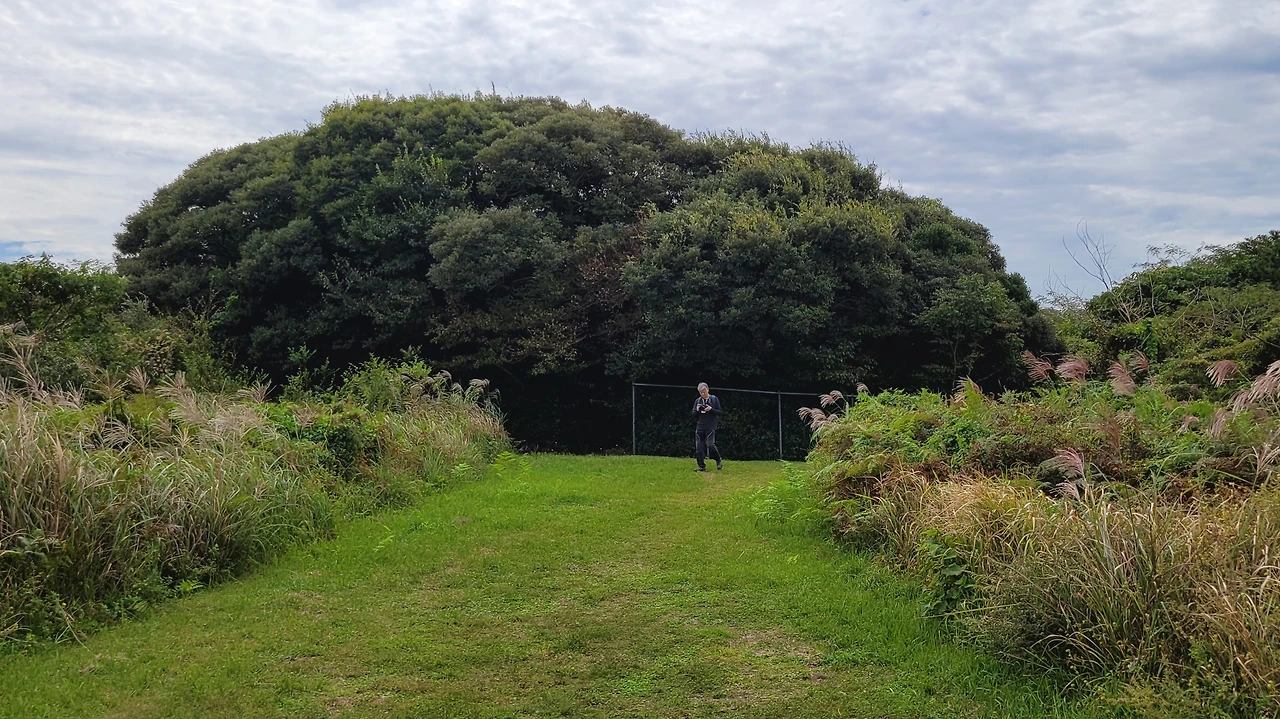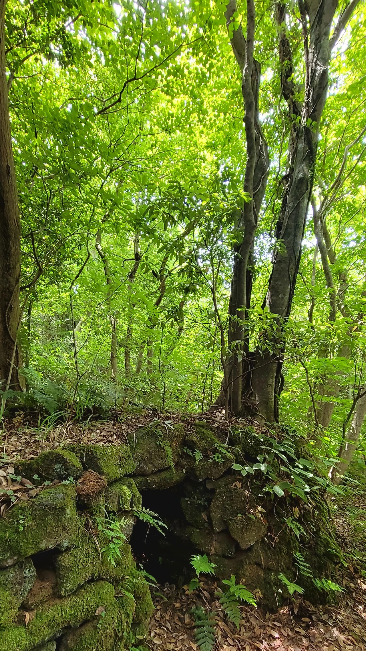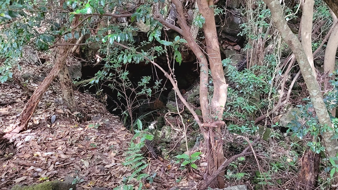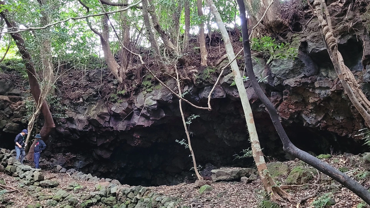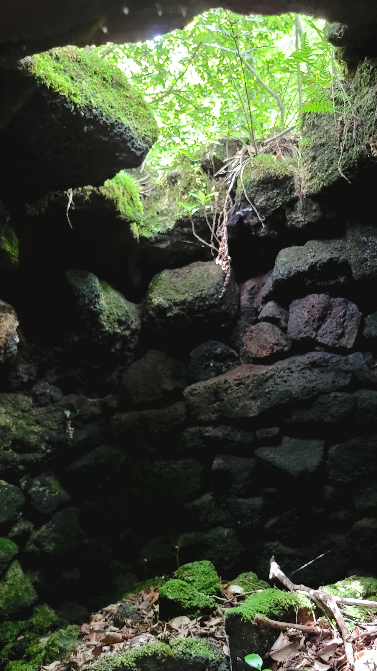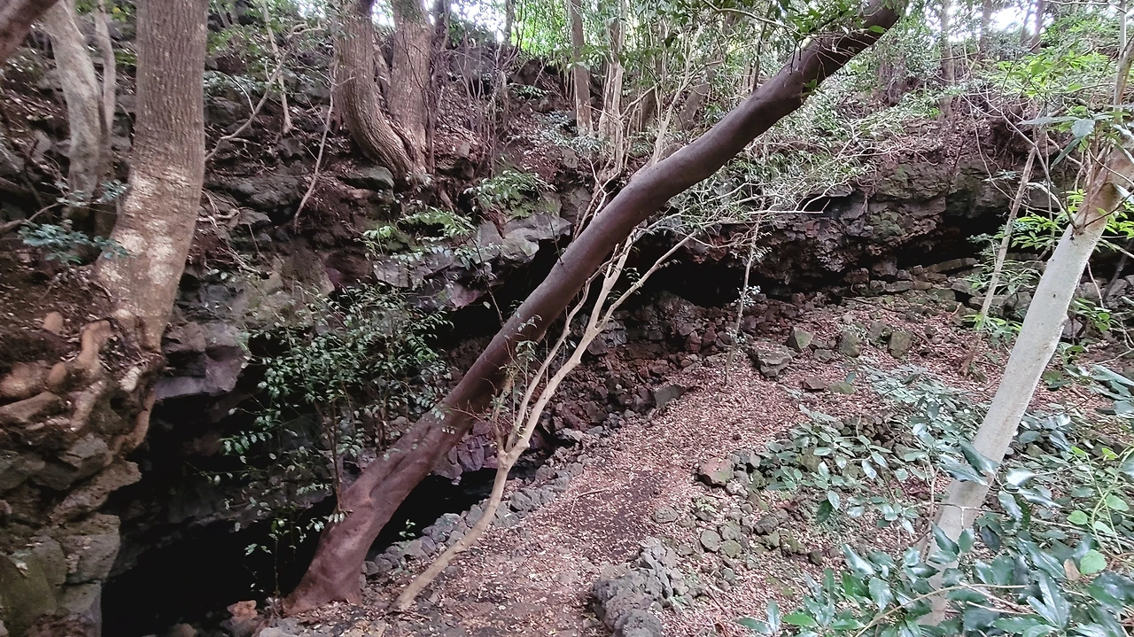 웃산전못을 돌아서니 용암대지가 둘러 꺼져 드러난 동굴이 나타난다. 웃산전굴 2 입구다. 땅바닥이 빙 둘러서 내려앉아 있다. 한참을 내려간다. 비공개 대형동굴이다.