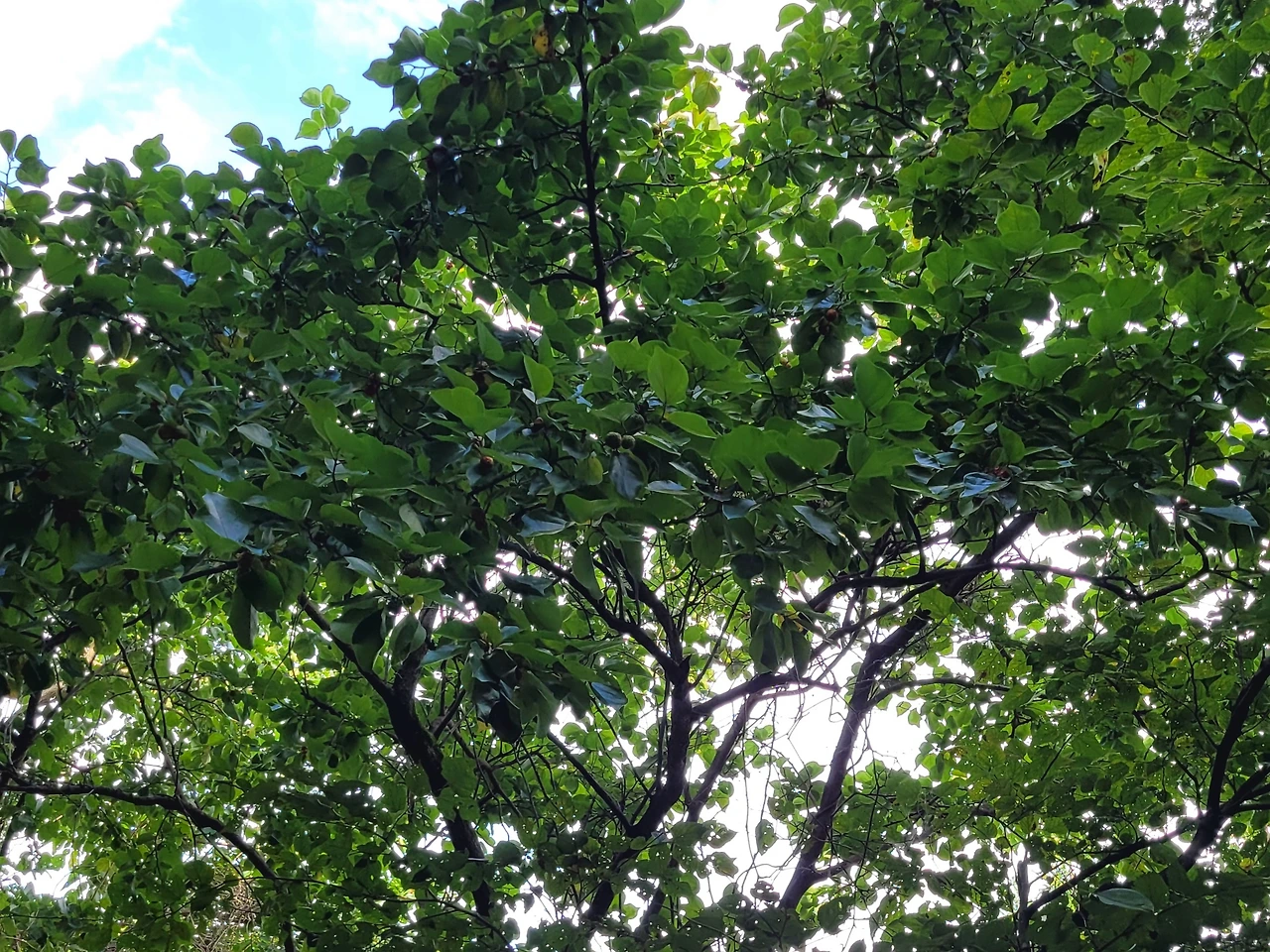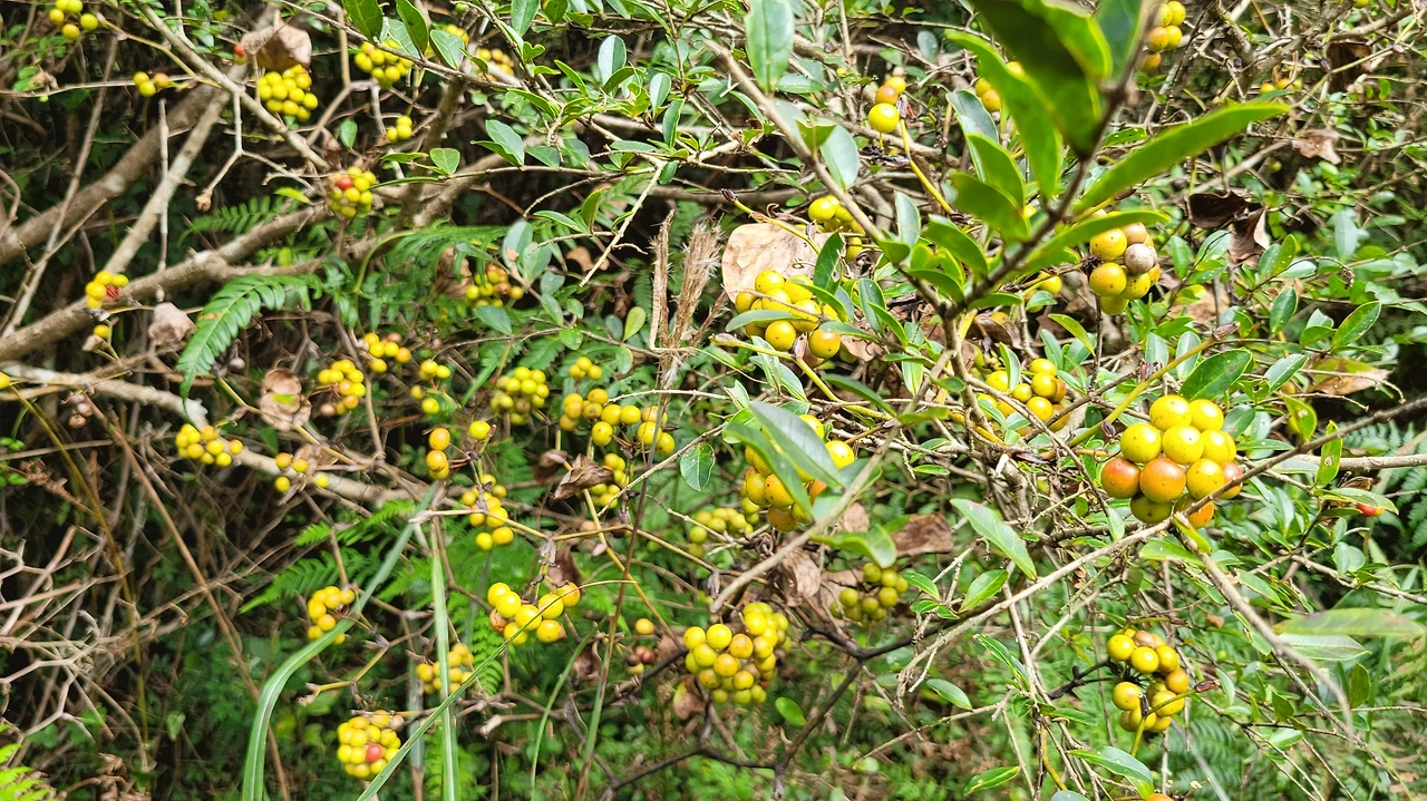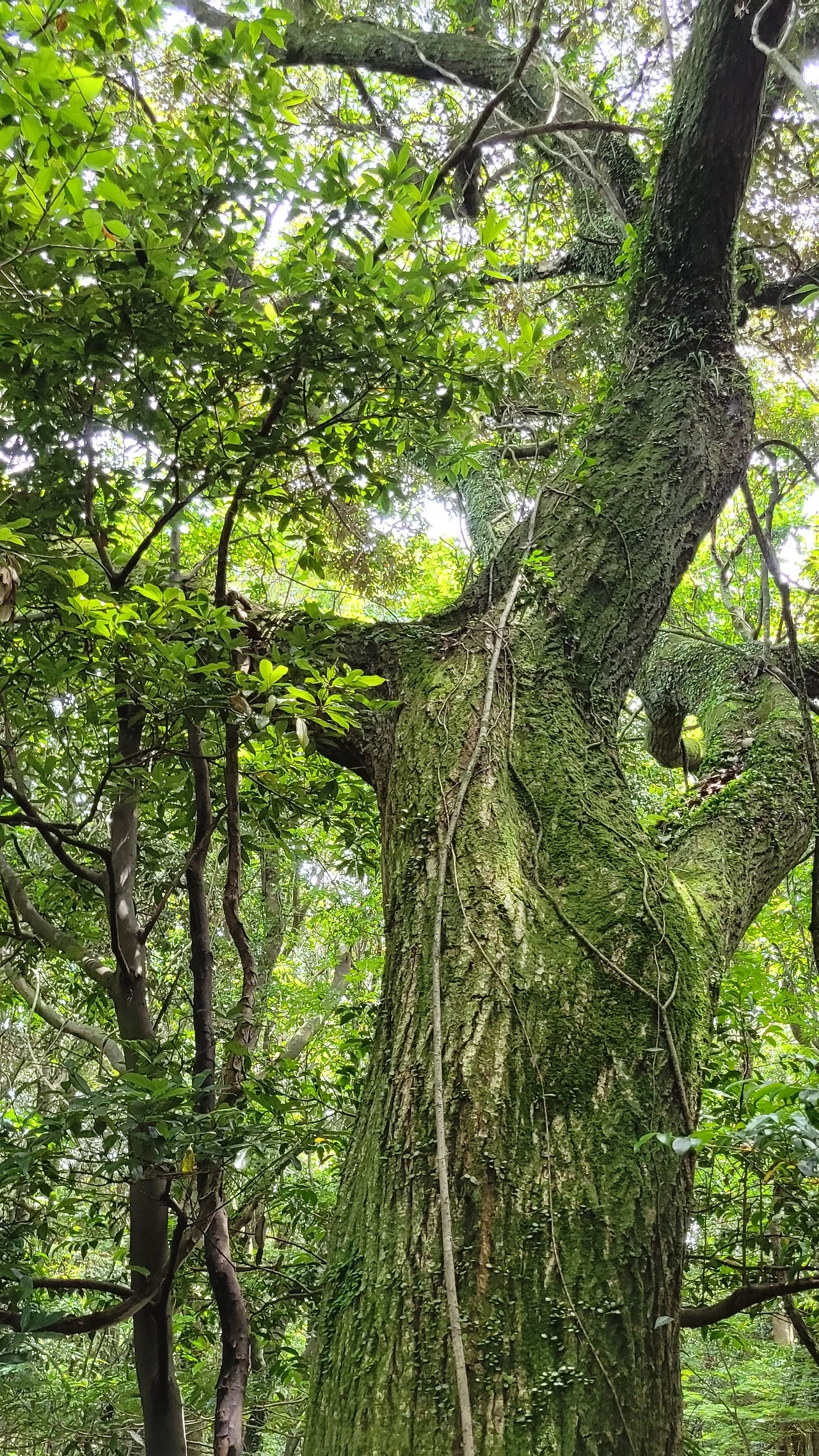 꾸지뽕.개활지 억새밭을 지나 본격적으로 난대림이 우거진 숲 속으로 들어간다. 새소리가 들린다. '용암이 개척하고 숲의 정령들이 완성한 길'이란 말이 실감 난다. 돌 많고 메마른 땅에서 무리 지어 자라는 꾸지뽕나무를 만난다.