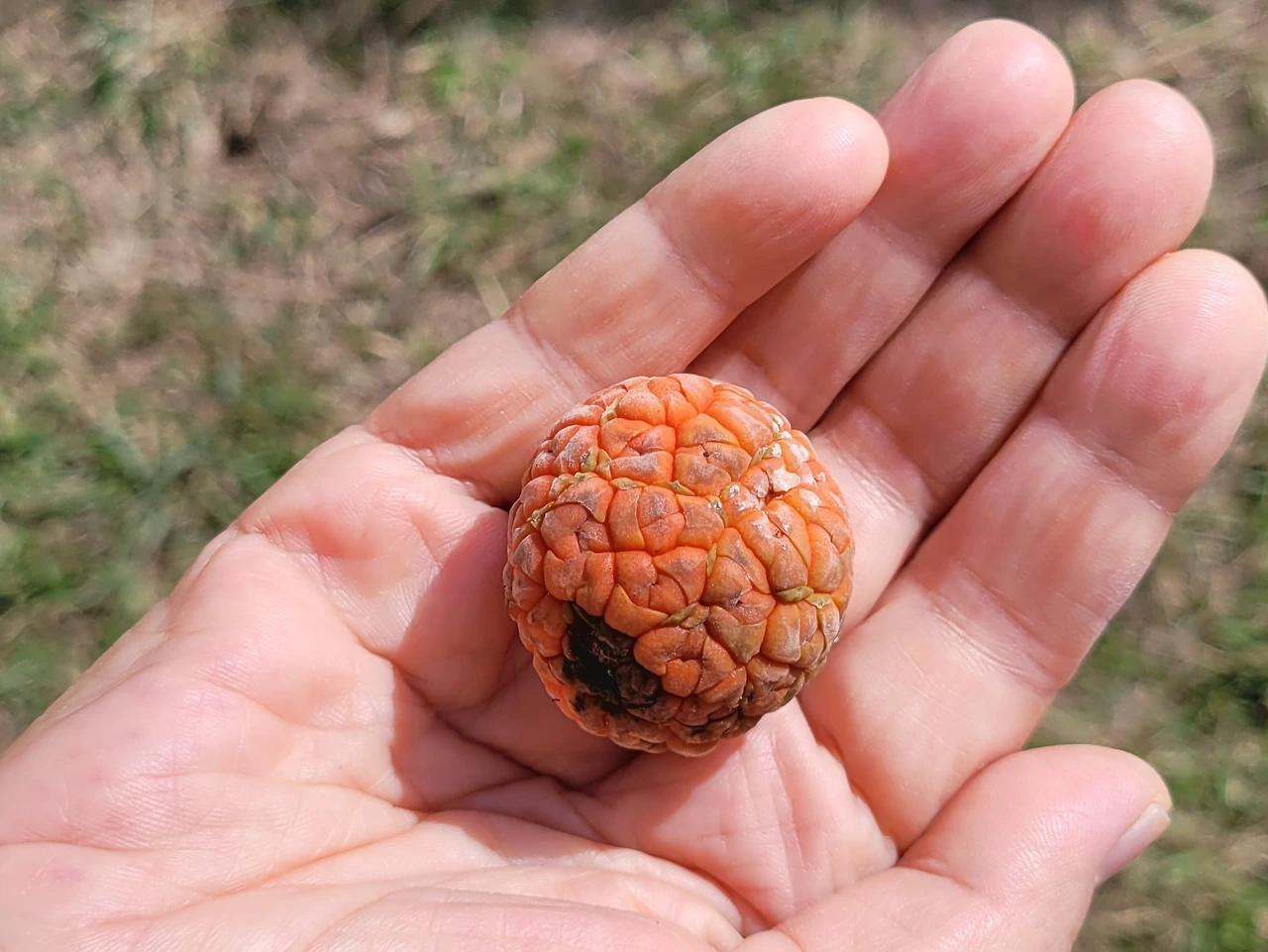 "꾸지뽕나무네요. 이게 열매고요. 가지에 가시가 있습니다. 뽕나무를 닮았지만 뽕나무가 아닌데도 '굳이 뽕나무'를 하겠다고 우겨서 '꾸지뽕나무'가 되었다는 이야기가 있습니다."
