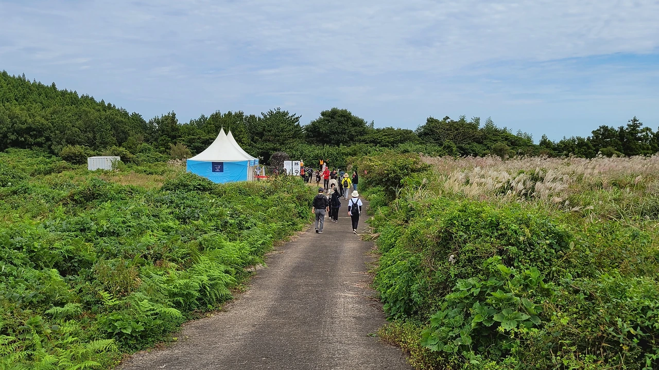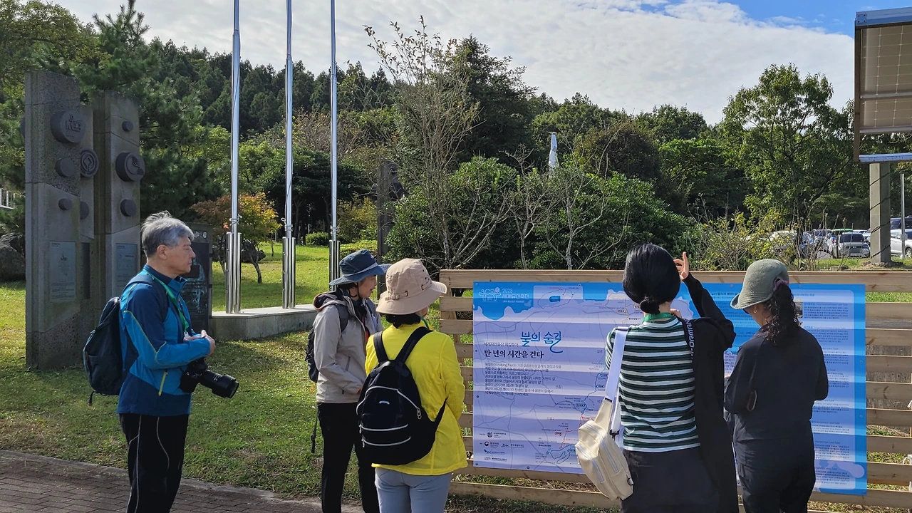 "이번 축전에서 공개하는 불의 숨길은 용암이 흘러간 길을 따라갑니다. 용암동굴 위로 걸을 거예요. 길이는 총 20여 km 정도 되고요. 직선거리와는 차이가 있지요. 오늘 우리가 걸을 2구간 용암길은 웃산전굴까지 인데, 4.8km입니다. 울퉁불퉁한 돌길로 난이도가 높은 구간이라 3시간에서 3시간 반 정도 걸릴 것으로 예상되고요. 자 출발합시다."