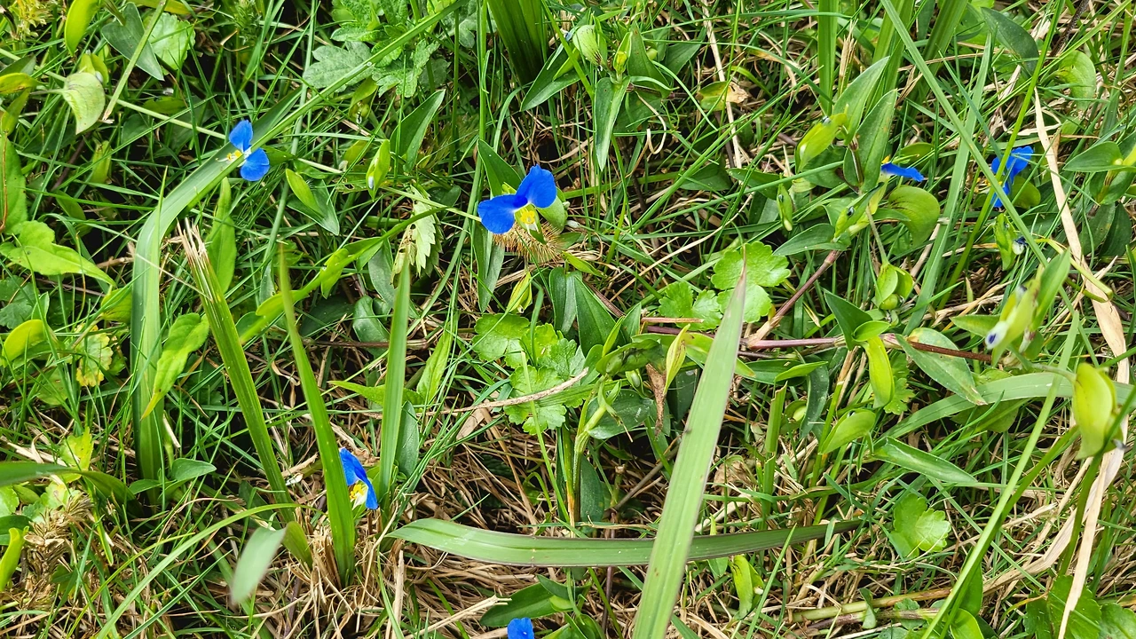 닭의장풀. 잎겨드랑이로부터 자라난 짤막한 꽃대 끝에 노란 수술을 담은 한 송이의 파란색 꽃이 피어 있다. 달개비, 닭의밑씻개라는 특이한 별명을 가진 한해살이풀. 굵은 마디마다 난 잎의 생김새는 대나무와 흡사하다.