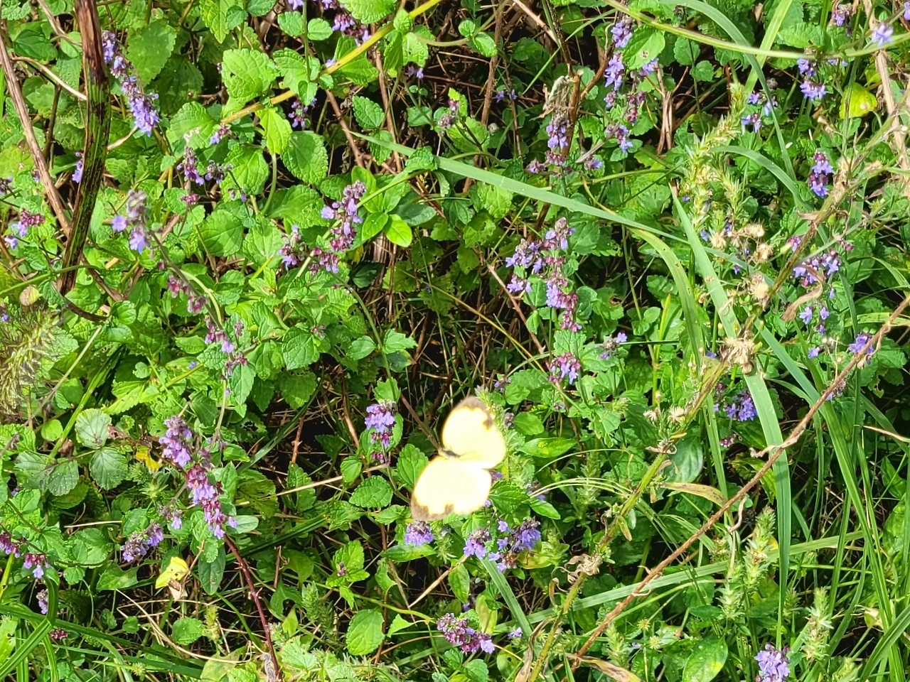 산박하가 곧게 선 줄기 위에 파란빛을 띤 자줏빛 꽃을 달고 있다. 잎이 깻잎처럼 생겼다.노랑나비가 날아와 꿀을 빨고 있다.