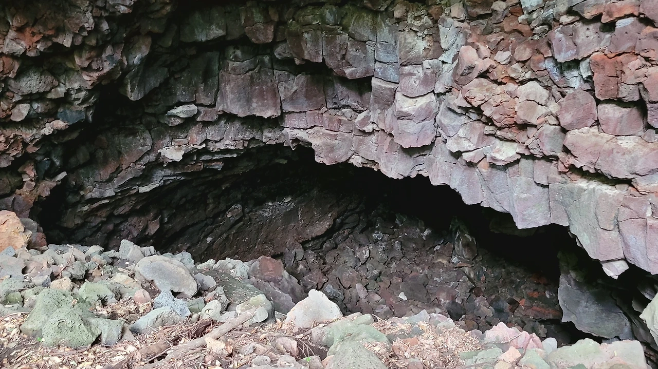 용암협곡이 이어지던 곳에 동굴 입구가 보인다. 웃산전굴 1 입구(이)다. 웃산전굴은 대형동굴인데, 동굴의 천장이 무너져 형성된 2개의 입구가 있다. 내려가는 계단이 있지만 일정에 쫓긴 나머지 2입구로 바로 간다.