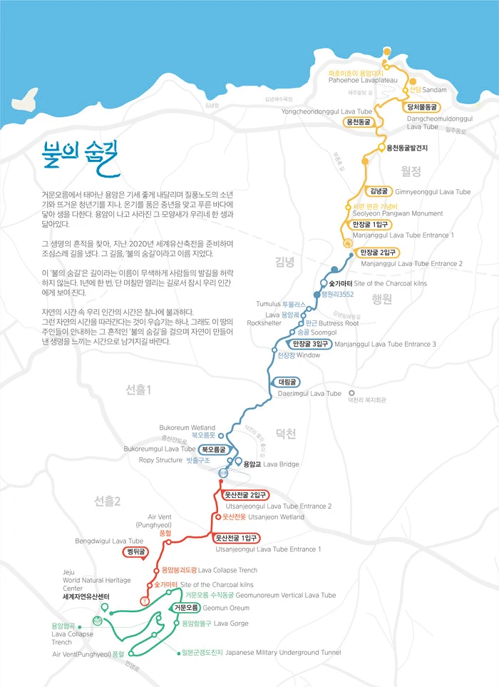 거문오름용암동굴계의 생성과정을 따라 만 년의 시간을 걷는다. 거문오름 분화구 안을 도는 1구간(5.5km)은 사전 예약을 하면 언제든지 갈 수 있는 상시 개방구역이다. 불의 숨길 2~4구간은 사람의 발길을 허락하지 않는 미개방 구역이다.1년에 한 번 세계유산축전 기간에 며칠만 한시적으로 길이 열린다. 우리는 평소에는 가지 못하는 2~ 4구간을 걸을 계획이다.
