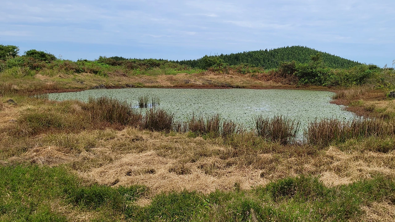 "용암대지 위에 지의류가 생겨 바위를 부스러트려 토양을 만들고 풀씨가 날아와 초지가 됩니다. 또 단단한 암반 바닥 때문에 물이 땅 밑으로 빠질 수 없다. 곳곳에 물웅덩이가 생겨나게 되지요. 소나 말을 방목하던 곳입니다."