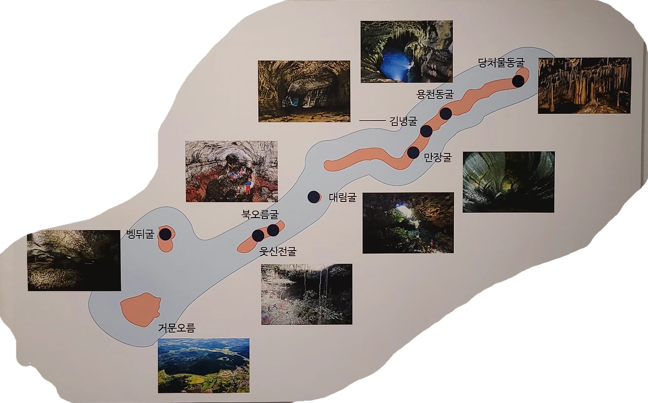 "거문오름에서 태어난 용암은 해발 350m 정도 되는 중산간 지역에서 기세 좋게 출발하여 거의 일직선으로 흘러내립니다. 벵뒤굴, 웃산전굴, 북오름굴, 대림굴, 만장굴, 김녕굴, 용천동굴, 당처물동굴을 차례로 만들어내며14km를 내달아 월성리 바닷가에 닿아 생을 마감합니다."