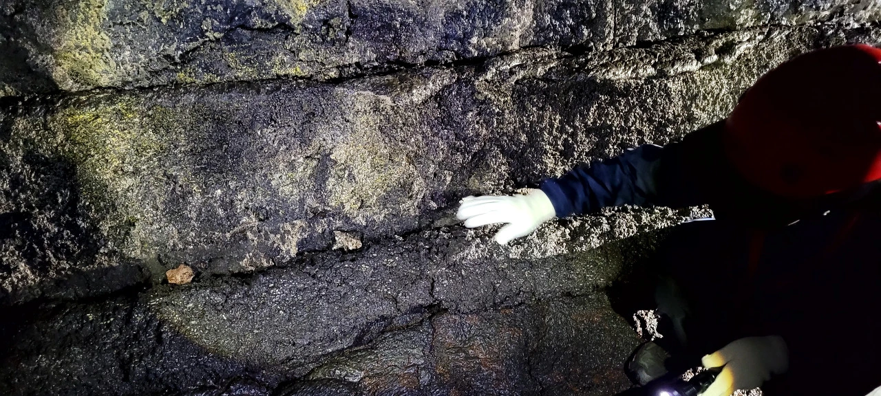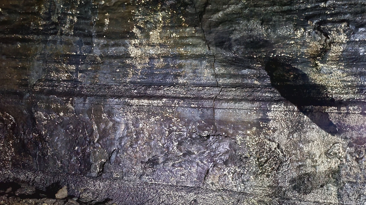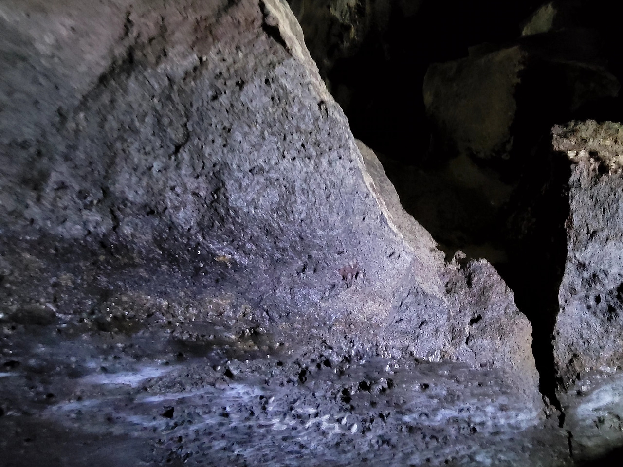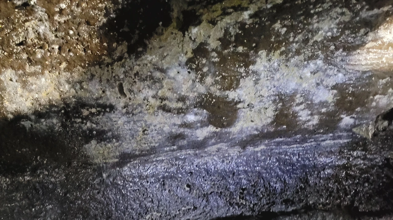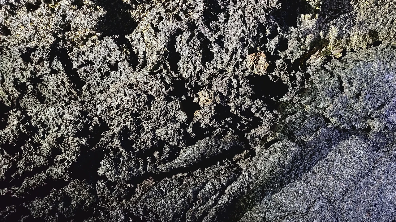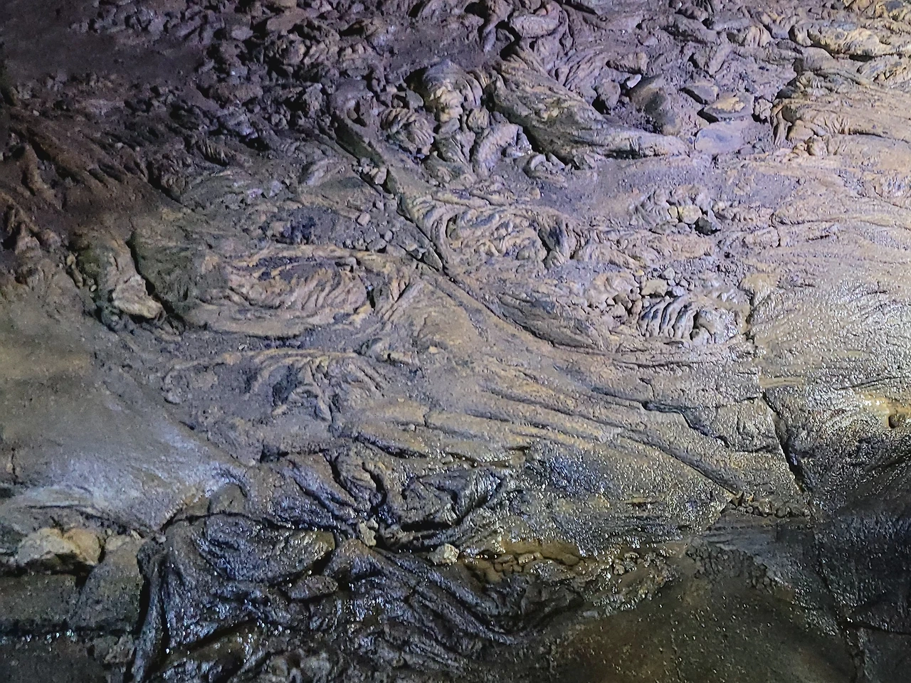 타이어 자국 같은 게 희미하게 보인다. 용암유선이다. 벽면에 선으로 용암 수위의 흔적을 남겨놓았다. 벽면에 다양한 높이의 용암유선이 그어진 것은 용암의 수위가 지속적으로 낮아졌기 때문이다.