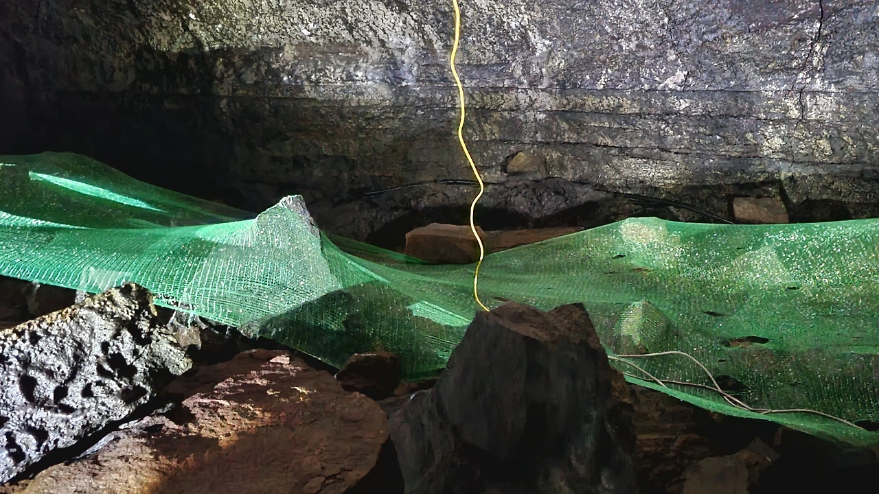 그물이 깔려 있다. 천장에서 돌이 떨어지고 있는가 확인하기 위한 것이다. 천장에 매달아 놓은 건 진동계이다. 균열 센서 로드로 벽에 균열이 진행되는 것을 모니터링한다.