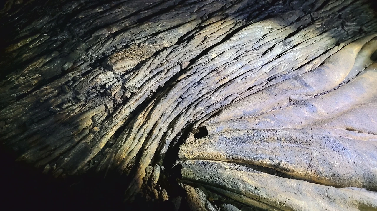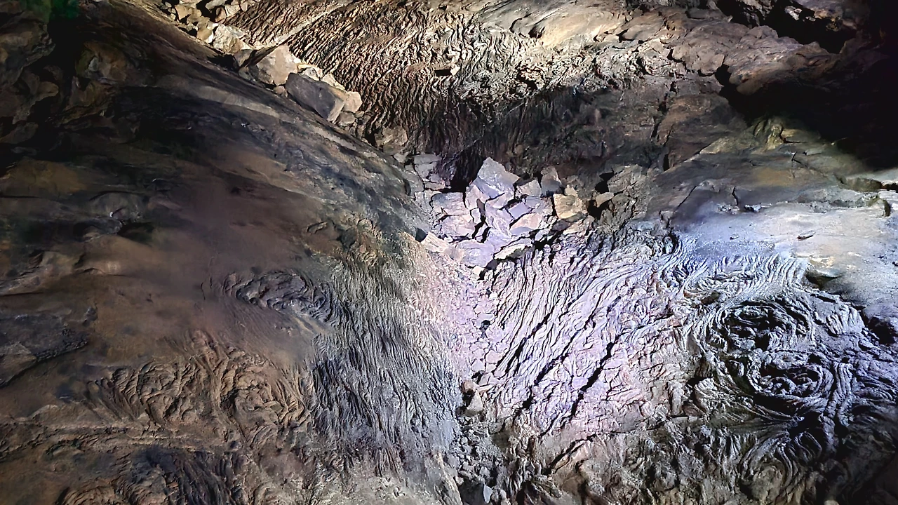 "미쳐 덜 굳은 용암이 밑으로 꺼지면서 말려들어 생긴 용암 생성물입니다. 용암두루마리 또는 용암롤이라고 합니다."