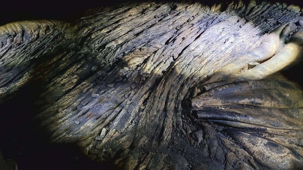 "밧줄처럼 꼬였지요. 용암이 살짝 굳은 상태에서 밑으로 흐르던 용암이 당겨져서 이런 주름이 생기게 된 것입니다."