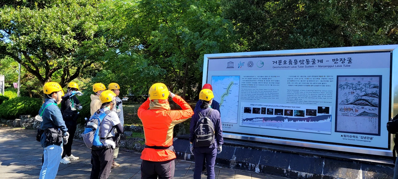 "반갑습니다. 세계자연유산 특별탐험대 큐레이터 고정범입니다. 오늘은 만장굴 1구간(비공개구간)과 김녕굴을탐사할 것입니다. 2시간 반 남짓 시간이 소요될 예정이니 화장실 먼저 다녀오세요. 헬맷과 장갑, 랜턴을 챙기세요."