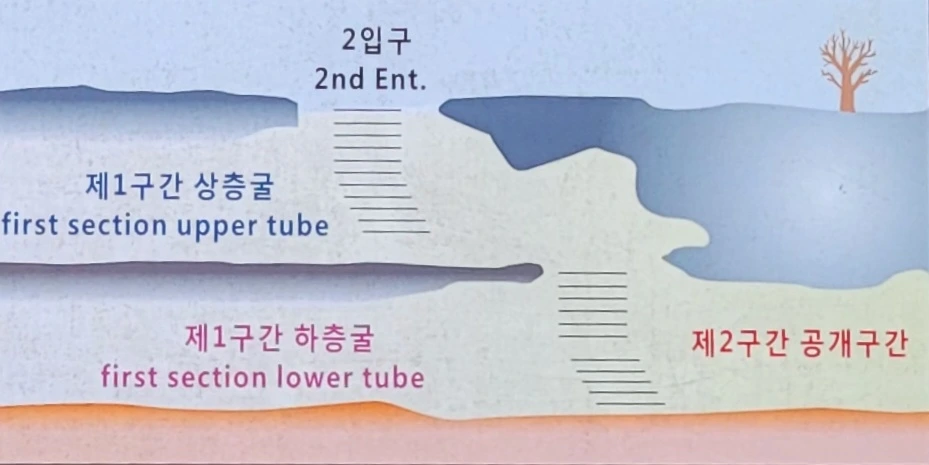 2 출입구로 들어간다. 만장굴은 부분적으로 다층구조를 지닌 용암동굴이다. 상층굴을 먼저 탐사한다.