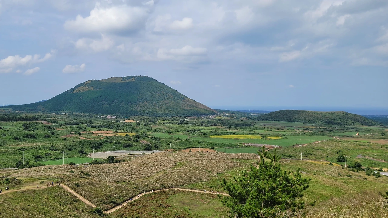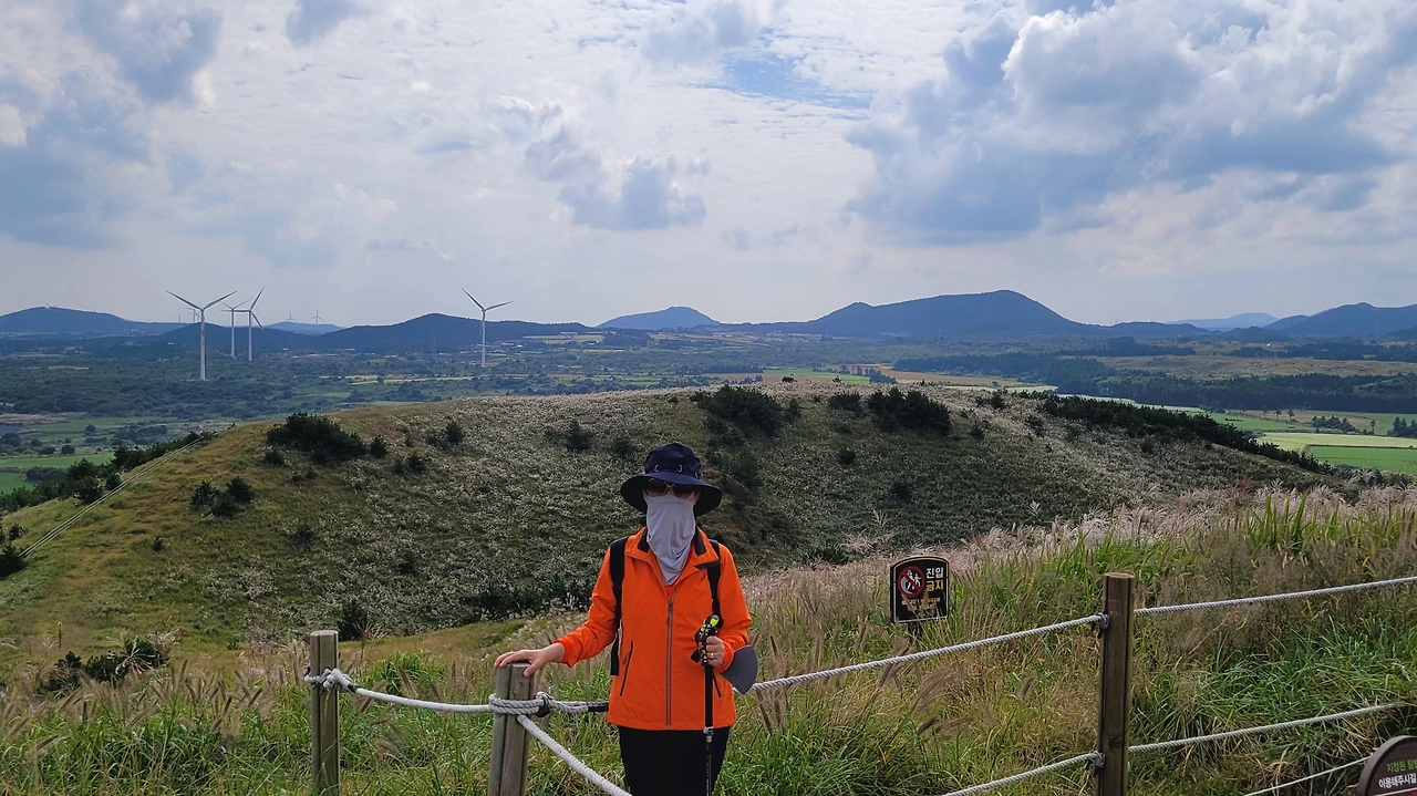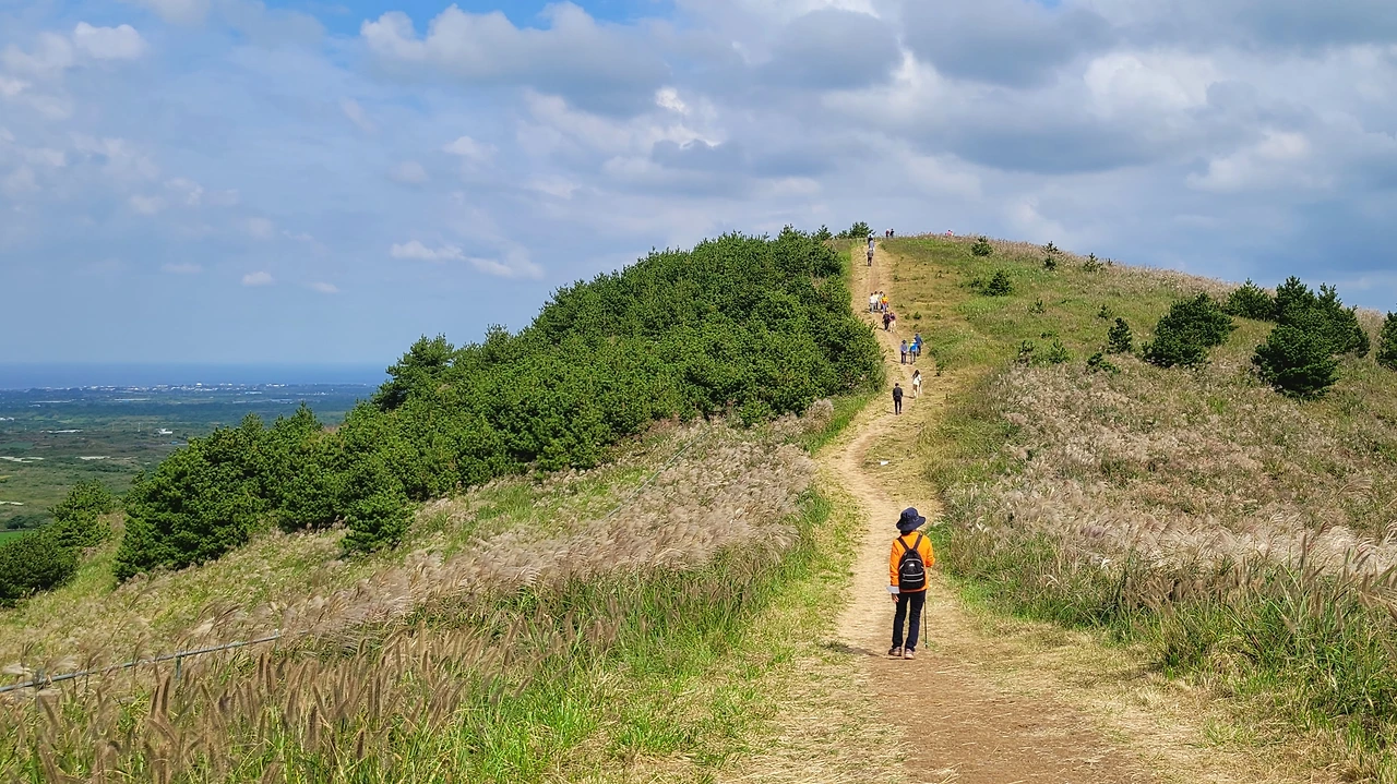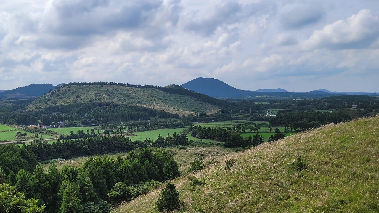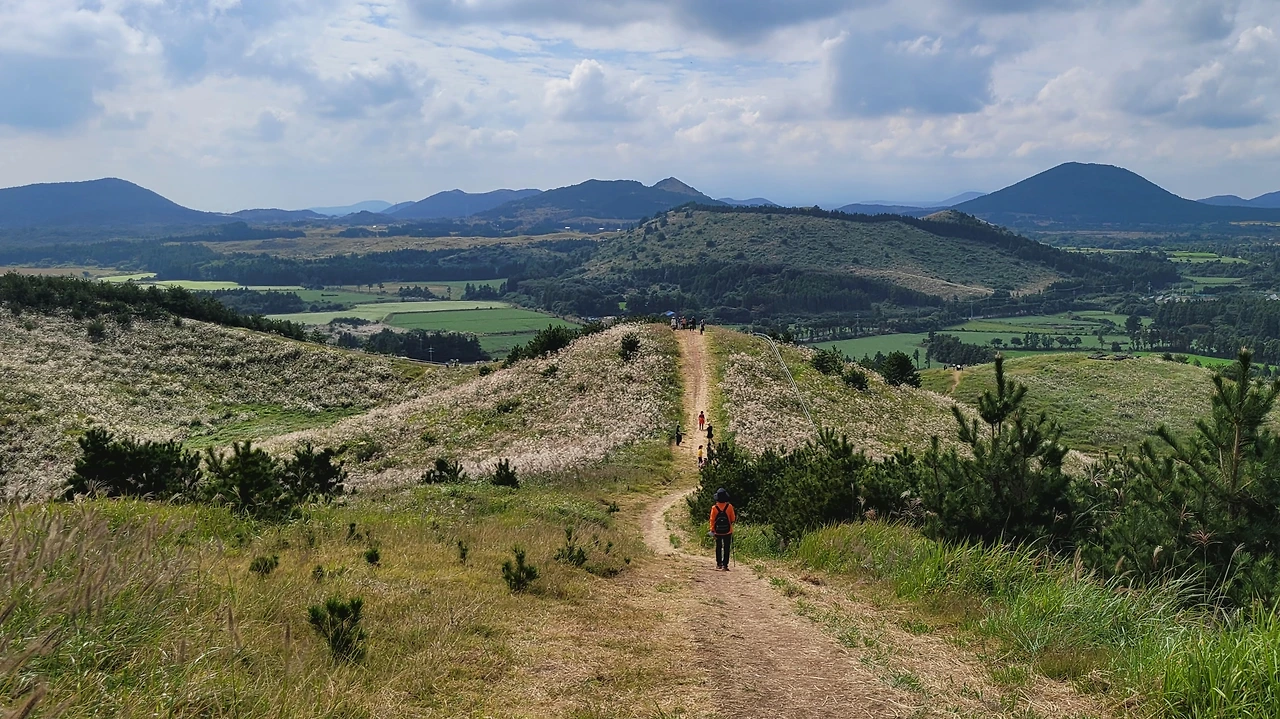 정상에 올라 움푹 파인 굼부리를 가운데 놓고 한 바퀴 돌던 둘레길은 막혔다. 북쪽 반만 개방했다. 남쪽 봉우리로 이어지는 굼부리 능선은 갈 수 없지만, 제주 동부지역의 오름 군락과 고즈넉한 제주 중산간 풍경을 감상할 수 있다.