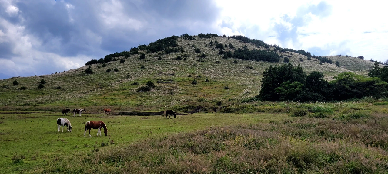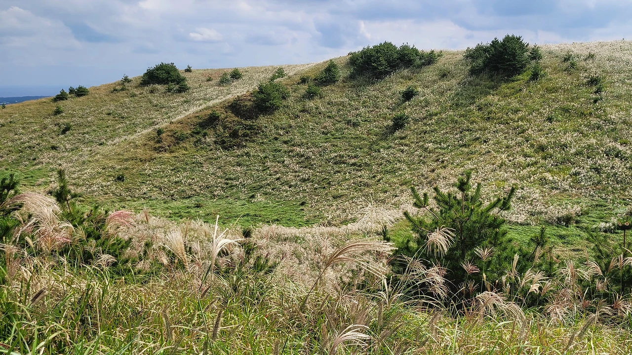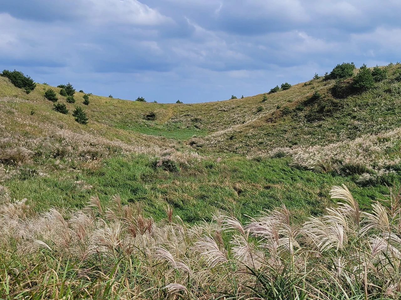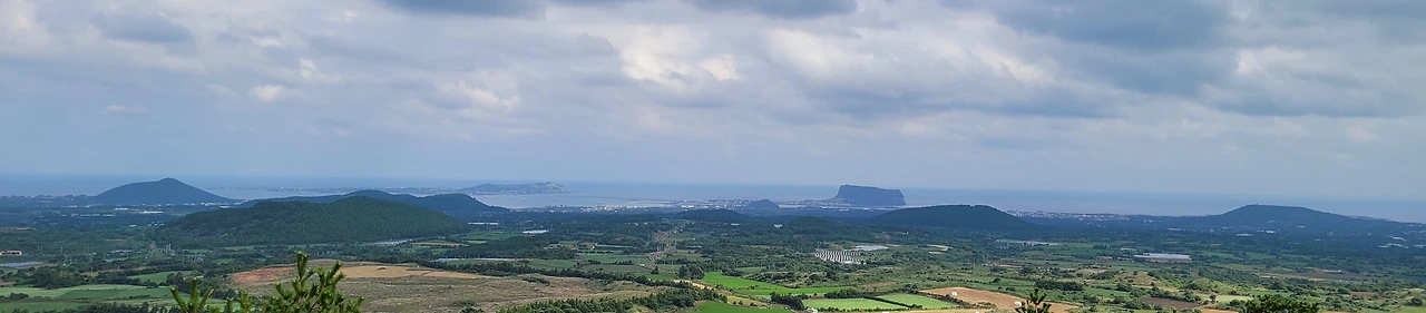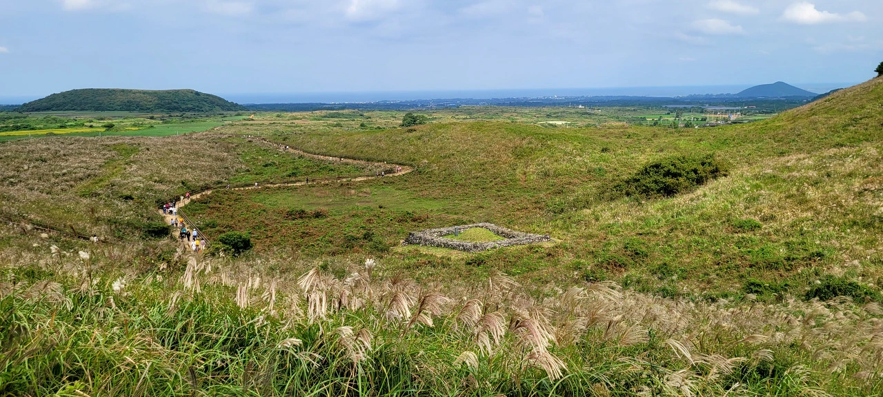 정상에 올라 움푹 파인 굼부리를 가운데 놓고 한 바퀴 돌던 둘레길은 막혔다. 북쪽 반만 개방했다. 남쪽 봉우리로 이어지는 굼부리 능선은 갈 수 없지만, 제주 동부지역의 오름 군락과 고즈넉한 제주 중산간 풍경을 감상할 수 있다.