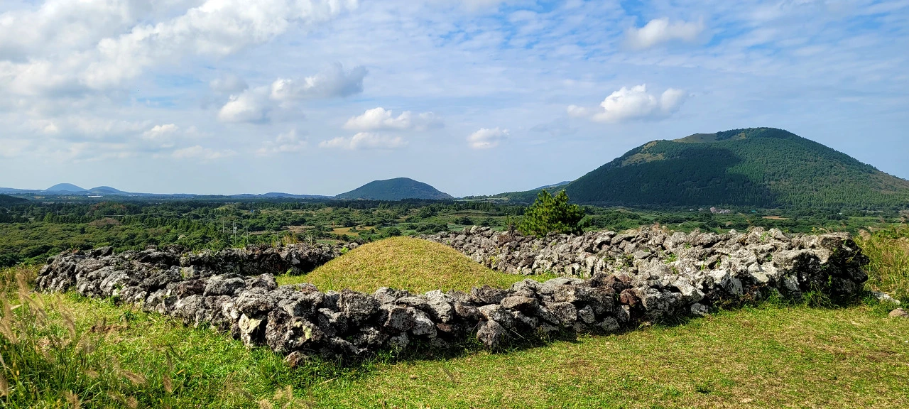 꼭대기에 무덤 1기가 있다. 제주 산담의 정수를 본다. 정방형 겹담이다. 정수리를 살짝 누른 듯한 다랑쉬오름을 바로 보고 있다. 권세가 있거나 돈이 있는 사람의 무덤인가 보다. 이 높은 곳까지 돌을 나르려면 힘들었을 텐데.