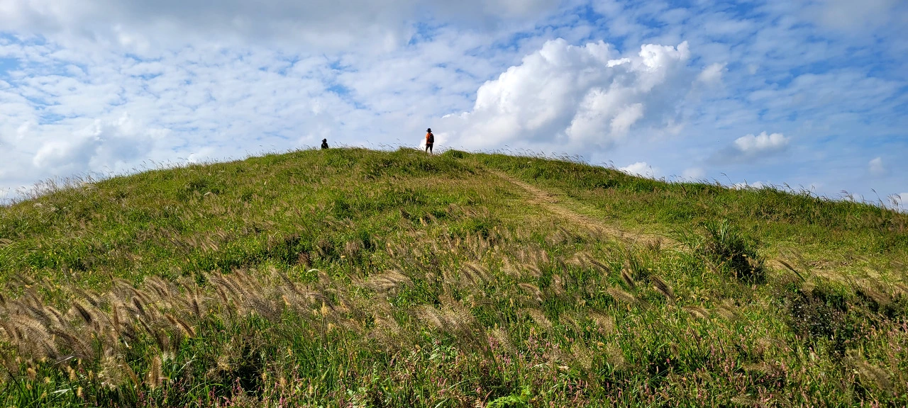 서쪽으로 손자봉이 가까이 다가온다. 좌우로 아부오름과 당오름을 거느리고. 손자봉 오르는 길이 확연하게 보인다. 억새가 좋은 인근 오름으로 소개한 글을 읽고 다랑쉬오름 가는 길에 들렀다가 혼이 났다. 정상으로 오르는 길이 희미하다. 들머리부터 잡초를 헤치며 간다. 억새 사이에 가시덤불도 엉켜있다. 진드기도 겁이 난다. 평소에 잘 안 하는 결정을 한다. 정상 오르기를 포기했다.