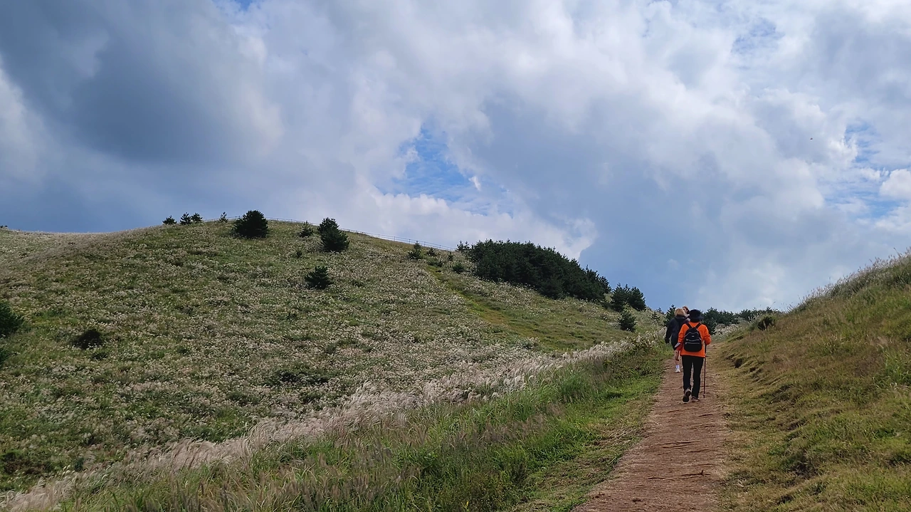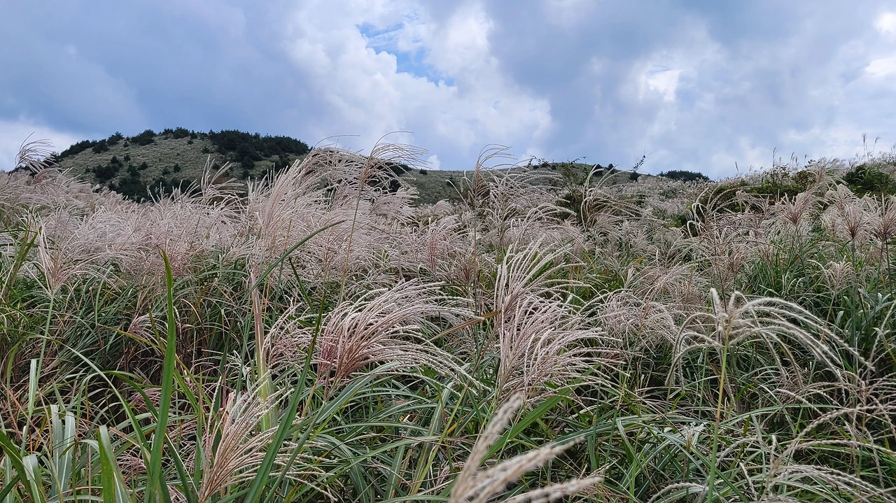 하산하면서 서사면에 봉긋 솟은 알오름을 오른다. 2년 4개월의 휴식년을 거친 산기슭은 내한성이 강한 수크령이 질긴 뿌리줄기를 사방으로 뻗친다. 원기둥 모양의 검은 자주색 꽃이삭이 바소꼴 모양을 하고 가을의 향연을 펼친다. 억새풀과 영역 다툼을 하고 있다.