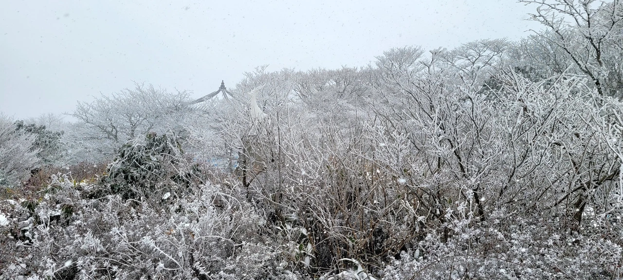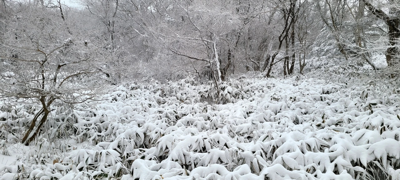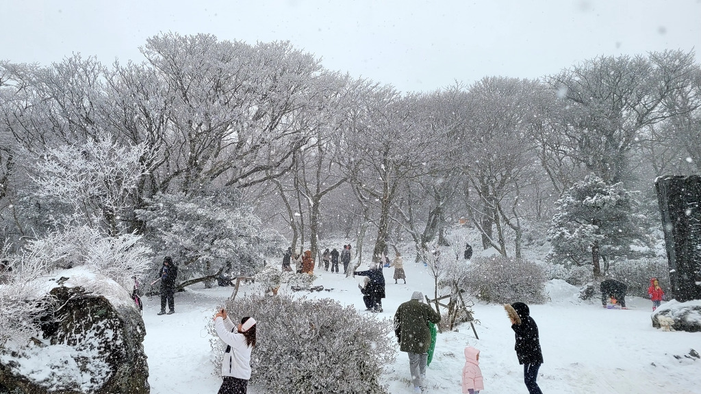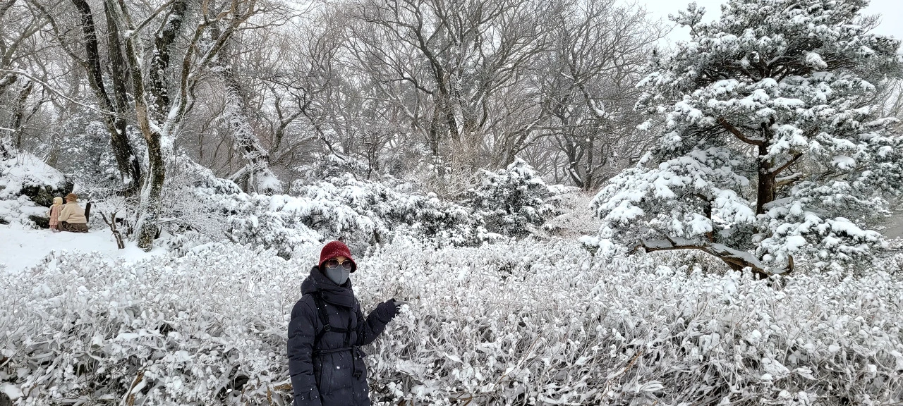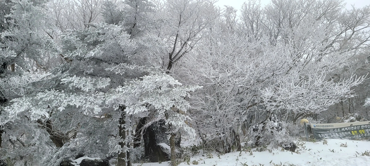 밤새 내린 큰 눈으로 도로 곳곳이 살얼음판이다. 급가속·급제동 금지, 차간거리 확보 등 안전 안내 문자가 계속해서 들어온다. 한라산을 종단하는 240번 버스를 탄다. 지난번 첫눈 내린 날과 달리 함박눈이 계속 내린다. 영실 매표소 가는 길은 눈으로 덮혀 타이어 자국이 보이지 않는다. 버스가 지나간 흔적을 이내 눈이 덮는다.