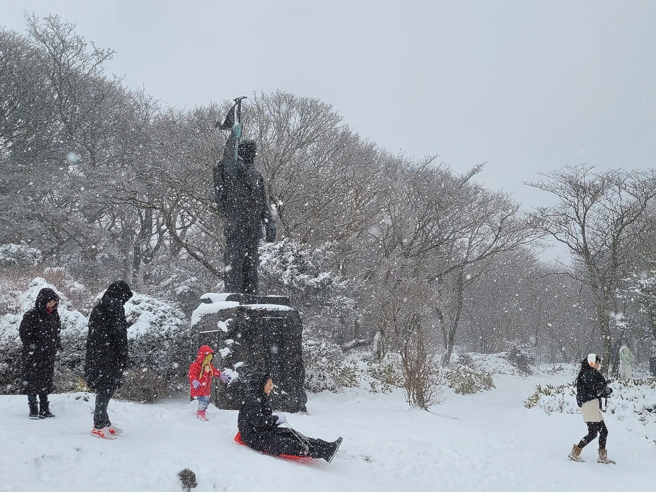 아이들이 눈썰매를 타며 환호성을 지른다.