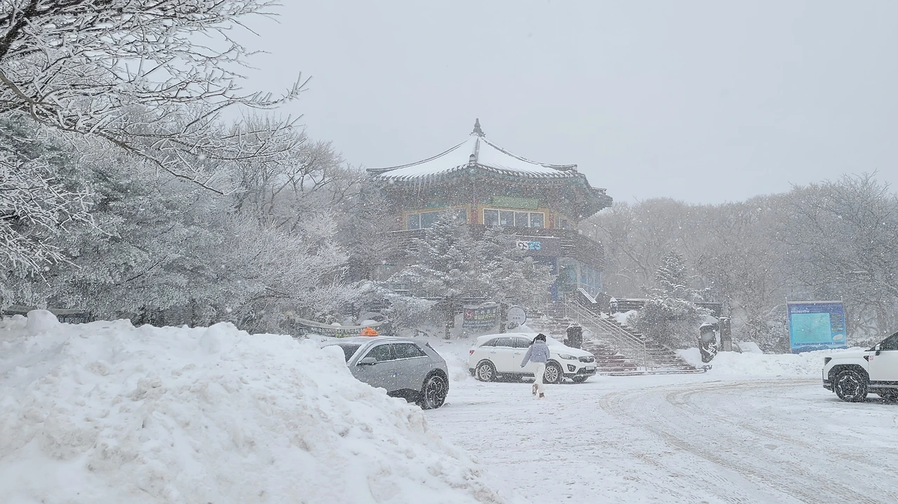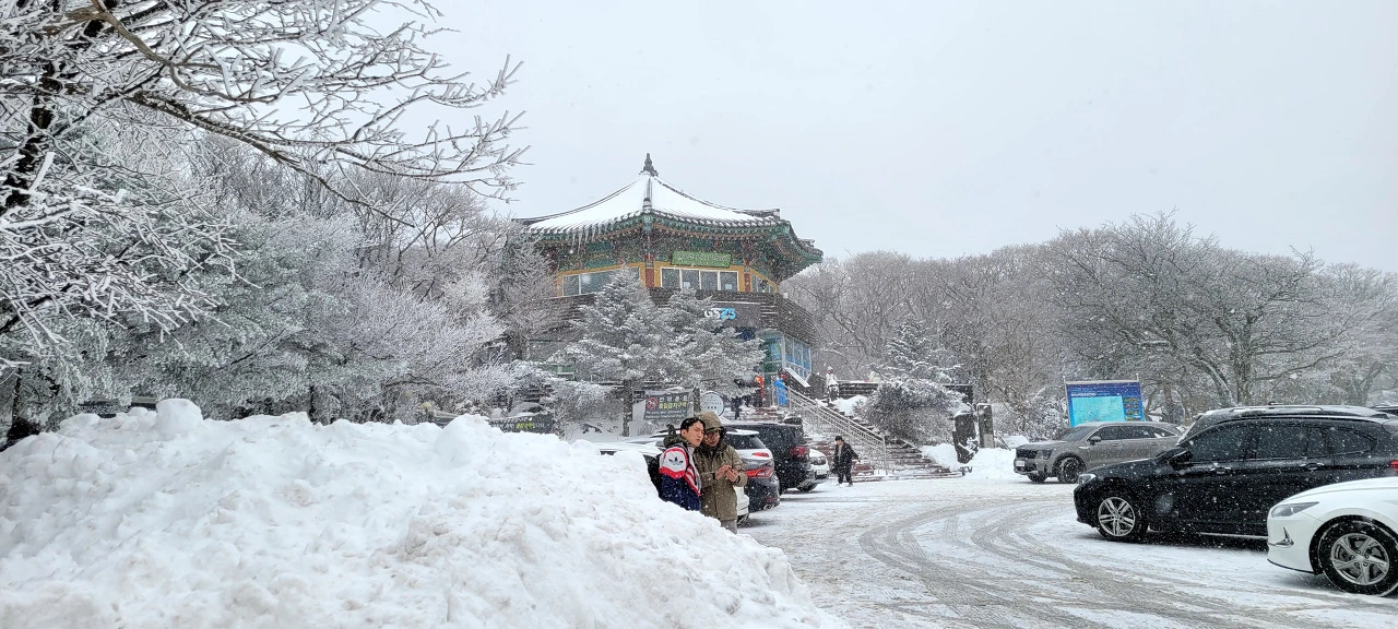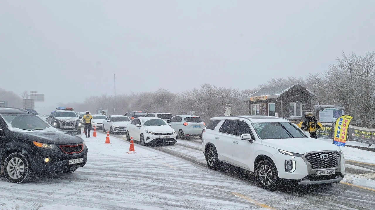 "승용차 운행을 통제합니다. 고립될 수 있으니 빨리 하산하십시오."
