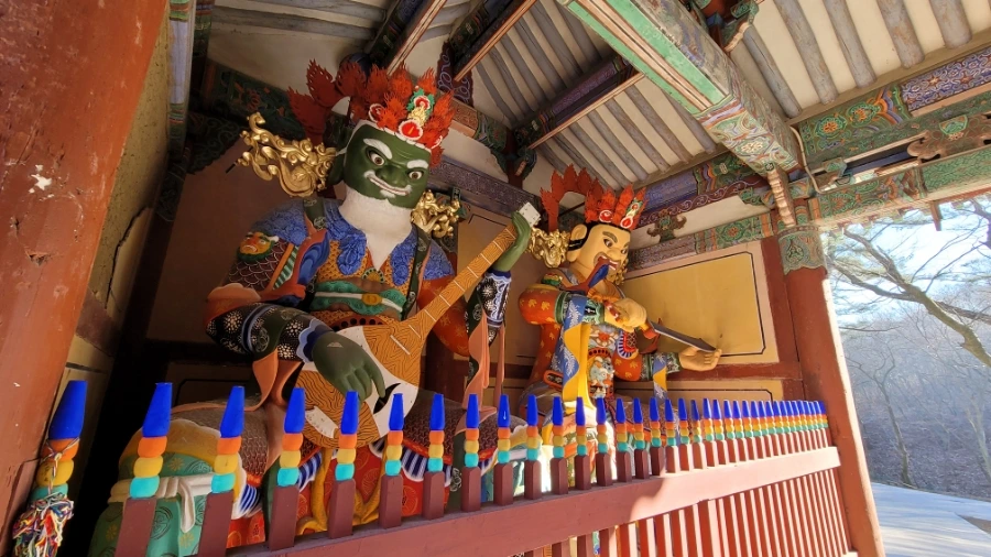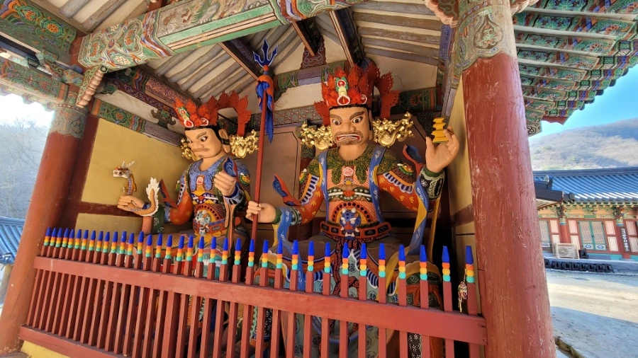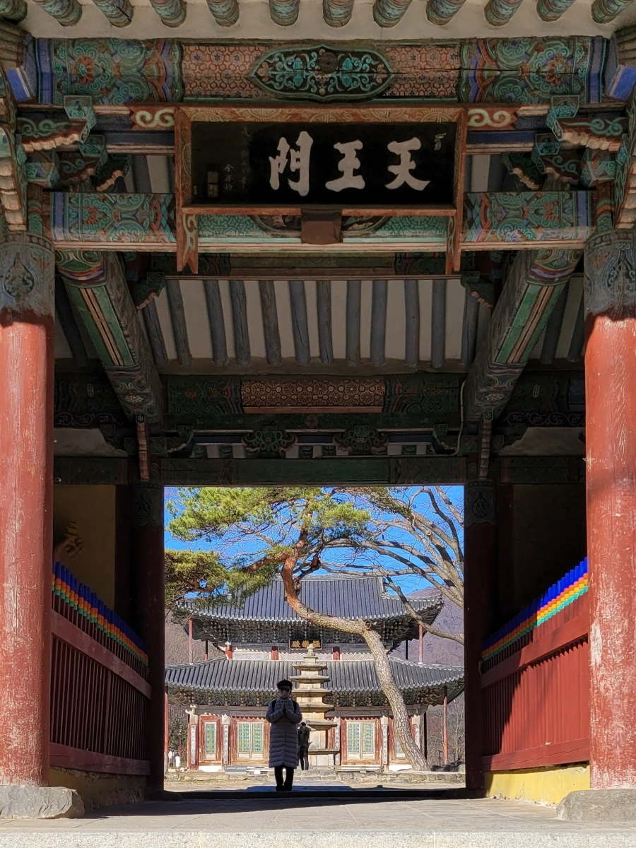 사천왕은 뒷전이다. 천왕문 사이로 보이는 극락전의 장중한 모습에 넔을 잃는다. 한쪽으로 비켜선 소나무가 구부려지며 이층 극락전의 지붕을 살짝 가린 풍경이 정말 그림같다.