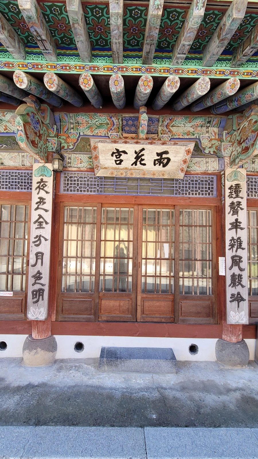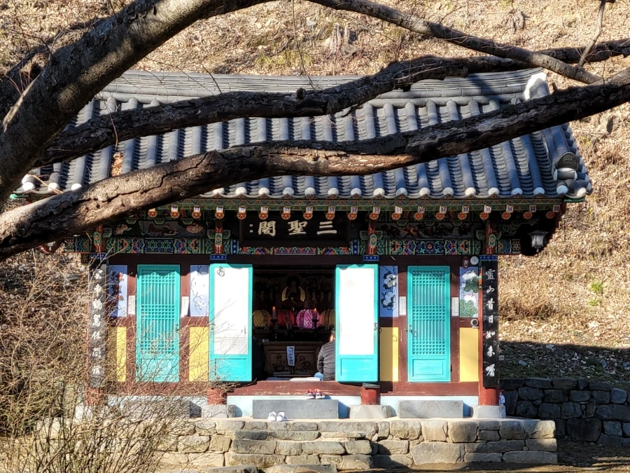 부처님이 설법할 때 꽃비가 내렸다는 말에서 따온 예쁜 이름의 선방을 지나서계곡물이 졸졸 흐르는 개울을 건너면,왼쪽에 산신각인 삼성각과 오른쪽 아래로 울타리가 처진 집이 있다.