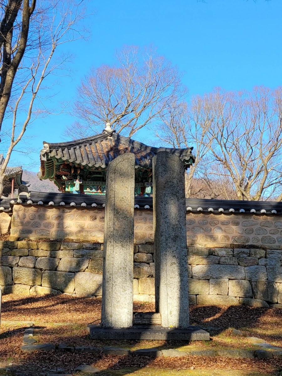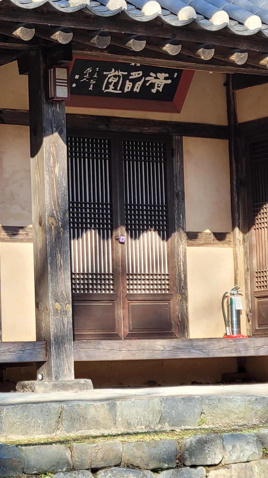 그 오른쪽 집이 김시습 별채라고 안내 팜프렛 에서 소개하는 청한당이다. 방문객의 출입을 통제하고 있다. 울타리 넘어서 바라보니 현판의 글자가 무슨 자인지 도대체 알 수가 없다. 자세히 들여다 본다. 한가할 한(閒)자가 뒤집혀 쓰여 있다.