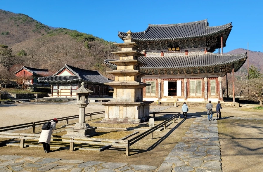 극락전, 오층석탑, 석등, 천왕문이 일직선으로 배치되어 정연한 느낌을 준다.