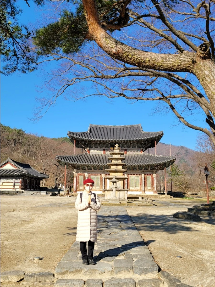 당간지주를 살펴보고 있는데, 연화심은 천왕문 앞에서 기다리고 있다. 천왕문을 통해 보이는 극락전이 액자 안에 든 그림처럼 아름답다고 빨리 오란다.