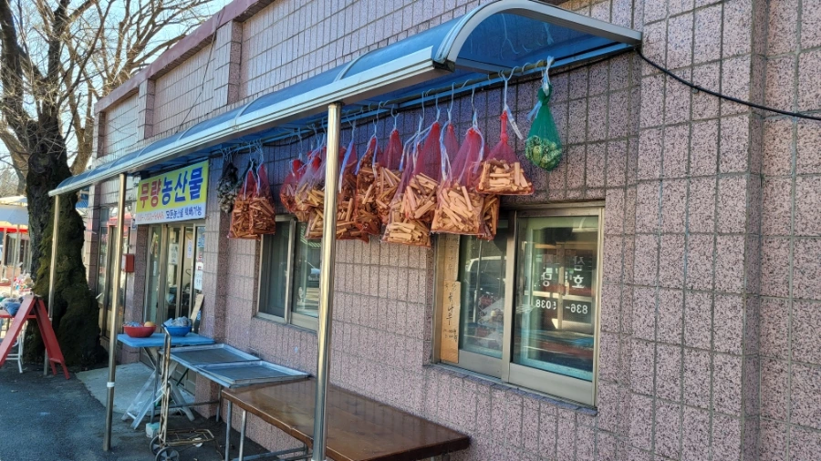 넓은 주차장에 비해 사하촌에 형성된 상가는 번잡하지 않아 좋다. 묵과 산채나물로 이름난 식당과 버섯, 산나물, 약초 등을 파는 가게가 몇 곳있다. 엄나무, 옻나무가지를 망에 넣어 걸어놓은 풍경에 부질없이 카메라를 갖다 댄다.