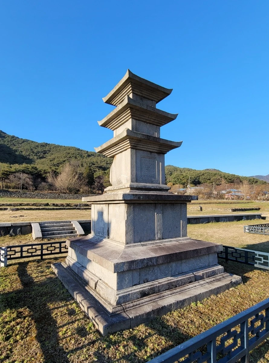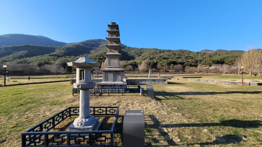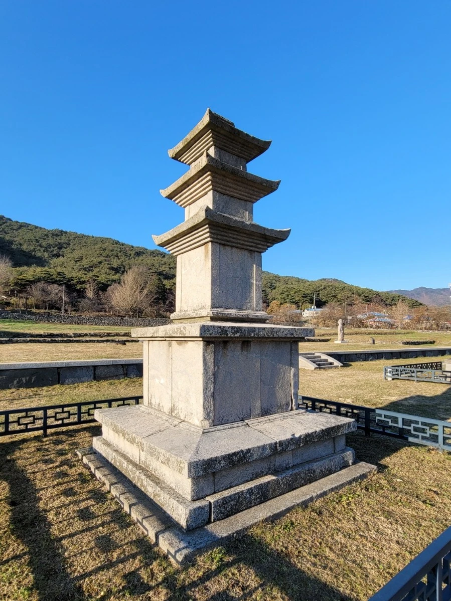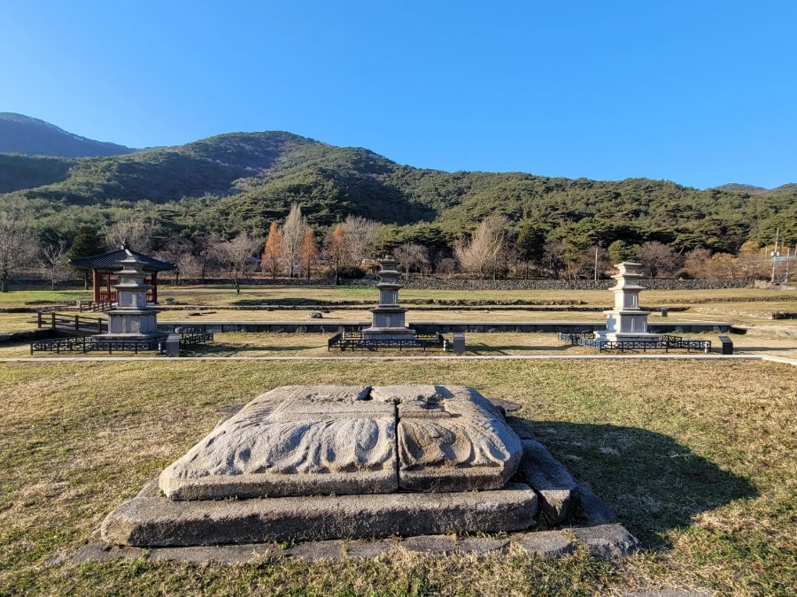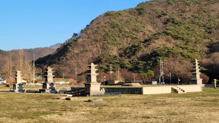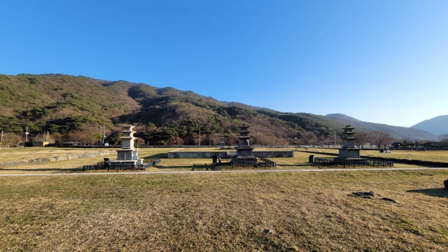 불상좌대 뒷편으로 보이는 비슷하게 생긴 3기의 삼층석탑이 금당과 강당 사이에 위치해 있다. 학계에서는 불교 건축물의 공간활용 예나 교리상으로 볼 때 그 배치가 이례적이라는 의문을 갖고 있다. 발굴조사 결과 3기의 삼층탑 밑에서 후세의 유물들이 다수 출토된 점으로 미루어 볼 때 다른 곳에서 옮겨온 것으로 추정된다는 설이 유력하다. 왜, 어디서, 언제 옮겨온 것인지는 모르나 정교하면서도 단아한 자태가 문외한인 내가 봐도 명작임에는 틀림없다.