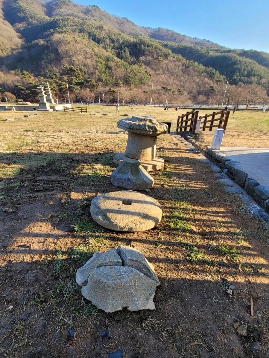 비각 옆에 승탑의 조각으로 보이는 연꽃무늬 받침돌과 지붕돌 등이 널여 있다. 왜 여기에 전시해 놓았는지 안내가 없다. 사라진 무염대사의 승탑를 암시하는 것은 아닐지 의문이 든다. 비문에 기록된 '무염대사가 입적한 지 2년 후에 세웠다'는 승탑은 행방이 묘연하다.