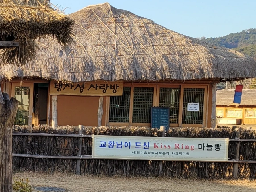 해미읍성을 탱자성이라고도 한다. 성곽 둘레에 탱자나무를 심어 적의 접근을 막았던가 보다. 카페가 있다. 탱자성 사랑방이다. 교황이 탱자성 사랑방에서 마늘빵을 드신 모양이다. 교황 마켓팅을 하고 있다.