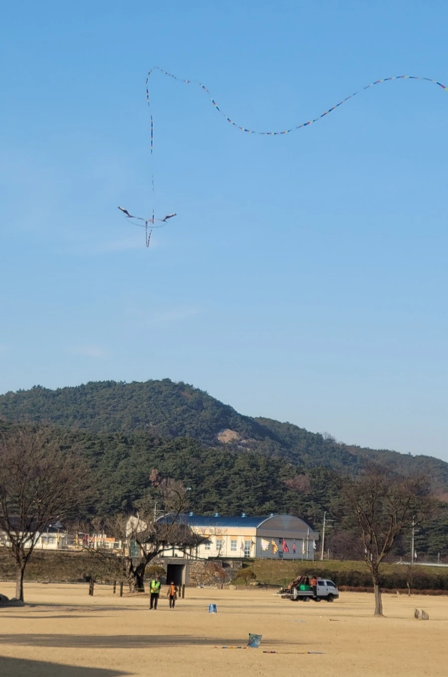 자성루(서문) 앞, 잔디밭에 연 날리는 사람이 보인다.