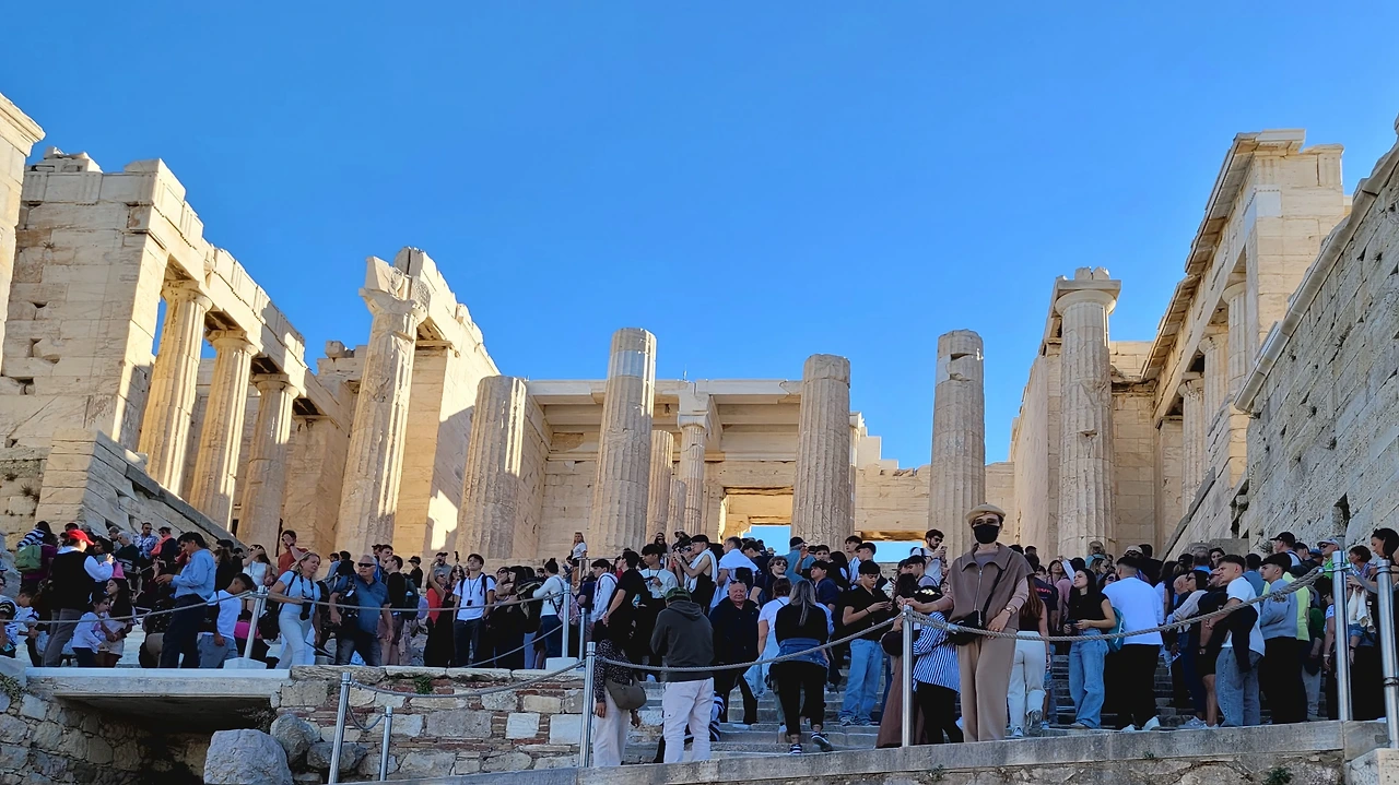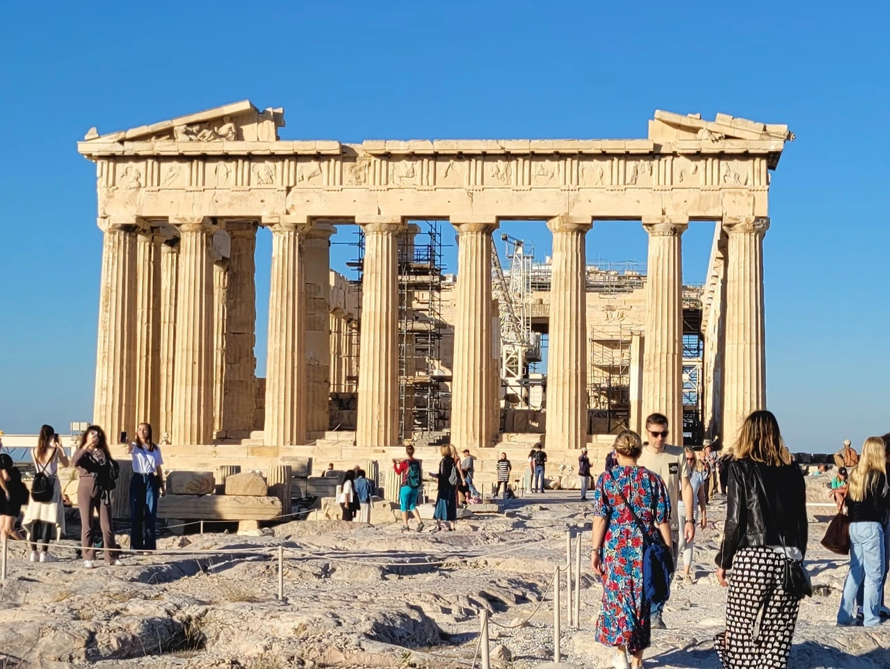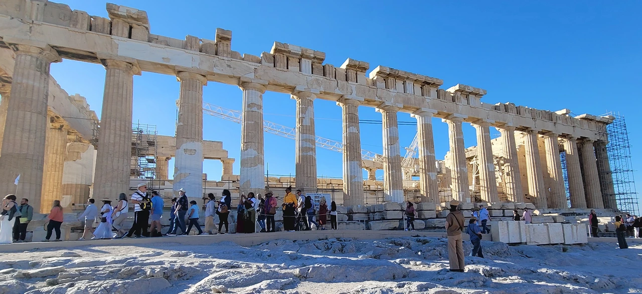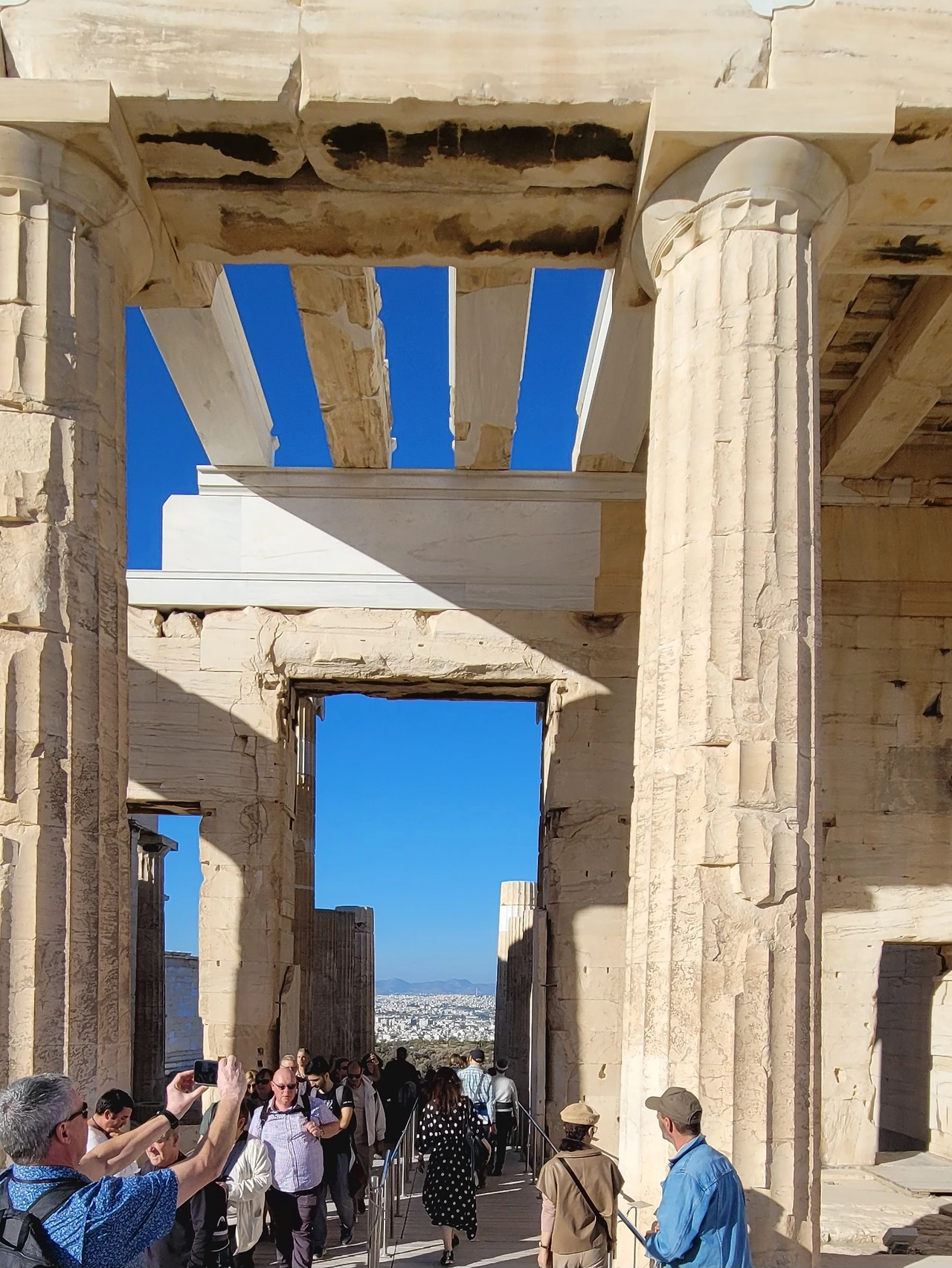 아크로폴리스로 오르는 길에 대리석이 깔려있다. 고급스럽게 치장했다기보다 대리석이 흔하였기 때문일 것이라고 가이드는 추정한다. 아무튼 반질반질하게 닳아 걷기가 불편하다. 미끄러운 오르막을 엉금엉금 기다시피 오르니 신전의 입구에 관람객이 빽빽하게 모여있다.
