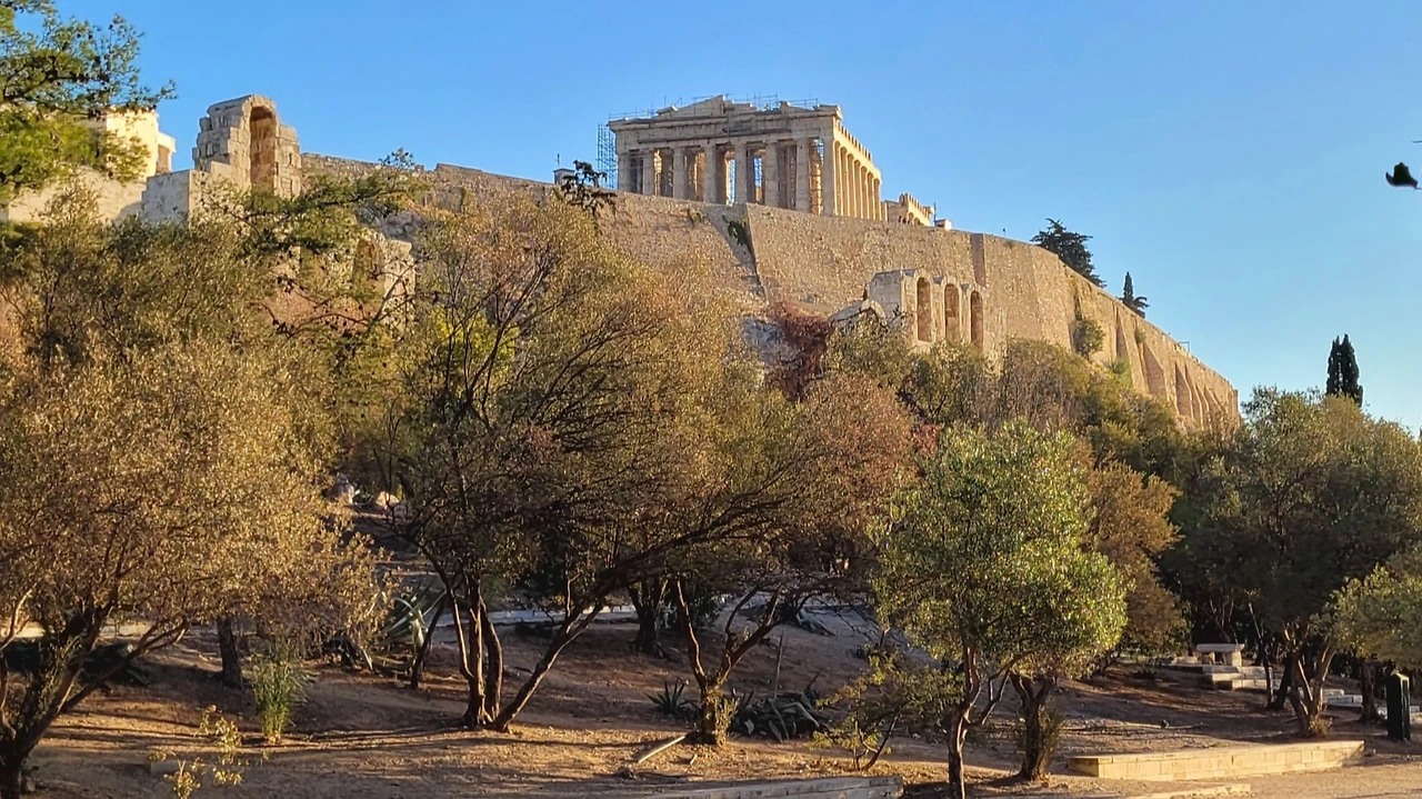 올리브나무 숲 뒤의 성채 위에 파르테논신전이 앉아 있다.