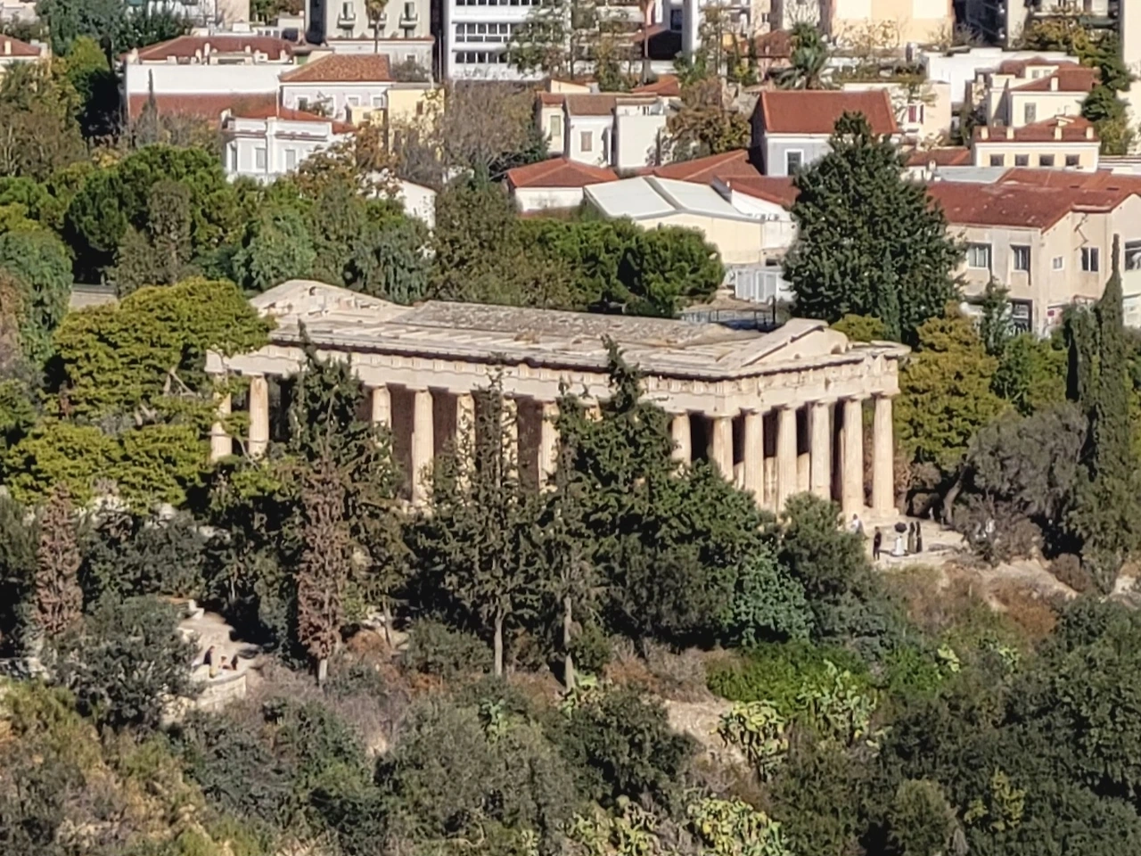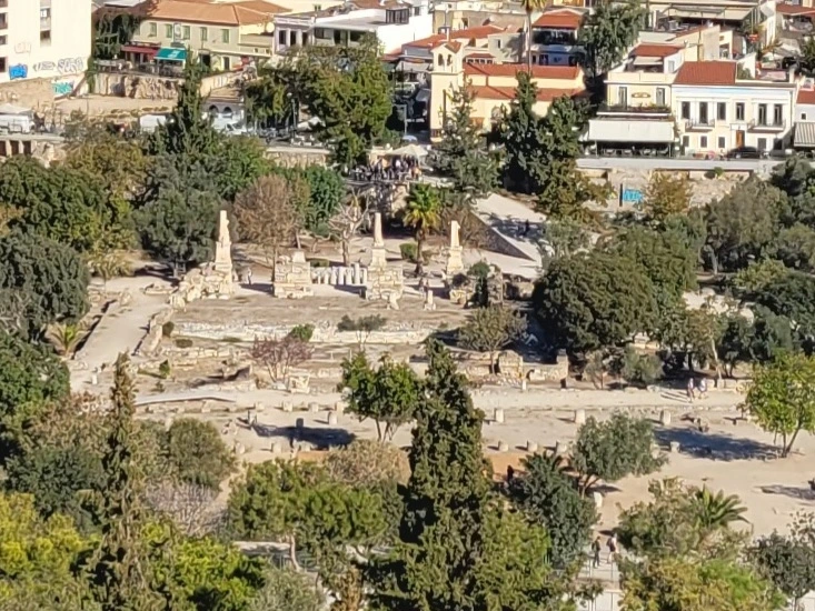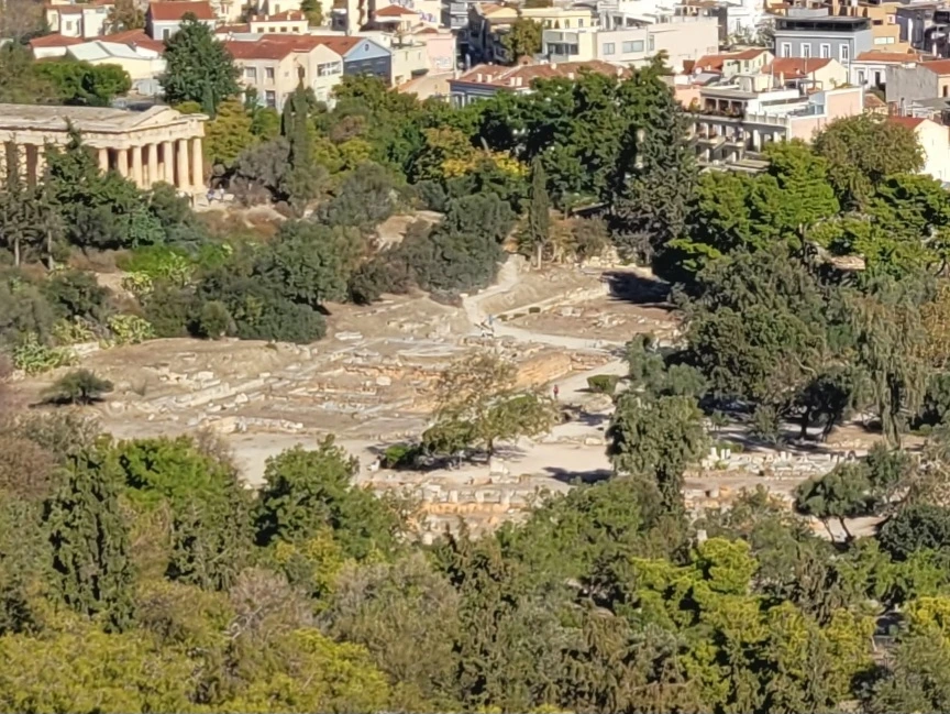 아고라가 한눈에 내려다 보인다. 고대 아고라의 전체 구조를 살펴본다. 서쪽에 헤파이스토스 신전, 동쪽에 아탈로스의 스토아가 배치되어 있다. 사진의 왼쪽과 오른쪽 끝이다. 중간에 아레스 신전, 12 신 제단, 제우스 제단, 아그리파 음악당이 있고 동남쪽으로 또 다른 스토아와 법정, 아포스틀레스 교회가 보인다.