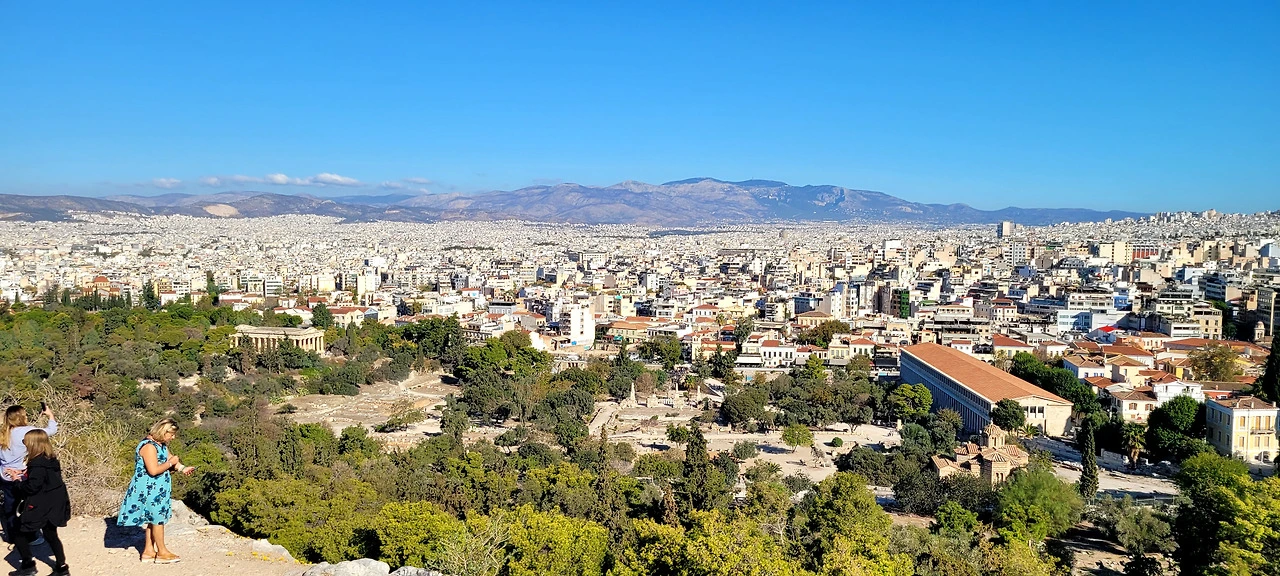 아레오파고스에서 아고라를 내려다본다. 왼쪽에 보이는 헤파이스토스 신전에서부터 오른쪽의 길다란 빨간 지붕의 박물관까지가 아고라다.