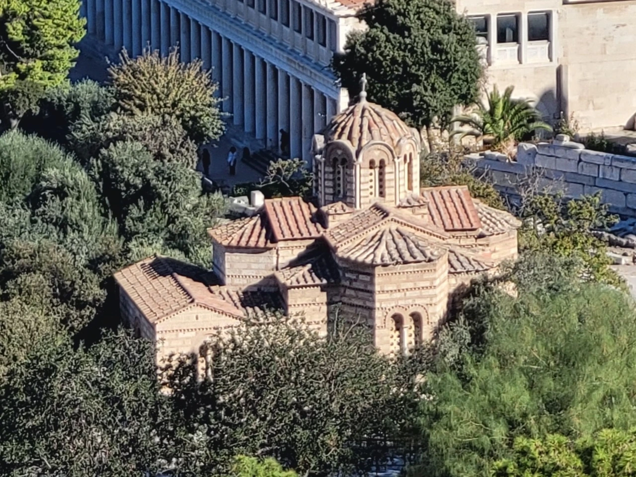 고대 아고라 박물관 앞에 비잔틴 양식의 건물이 보인다. 아포스틀레스 교회다. 비잔틴 중기 건축의 특징이 살아있다. 정사각형 공간의 가운데에 돔이 있고, 돔을 중심으로 십자 모양의 건물이 교차한다.