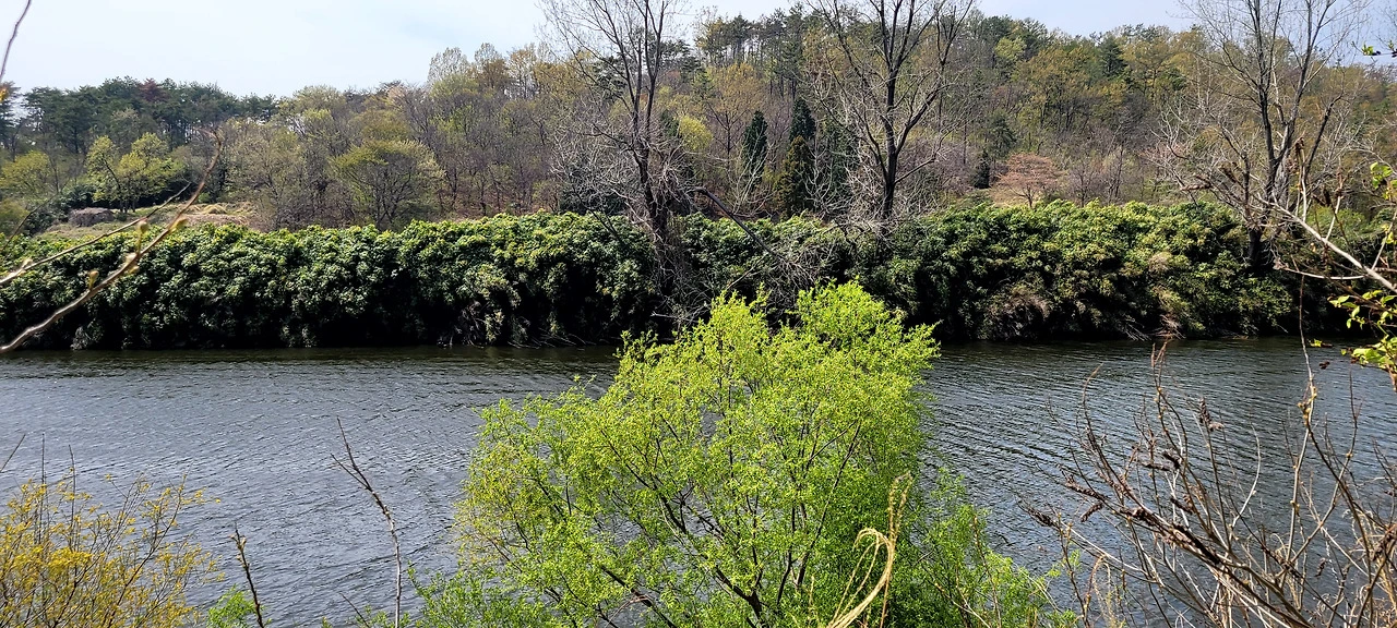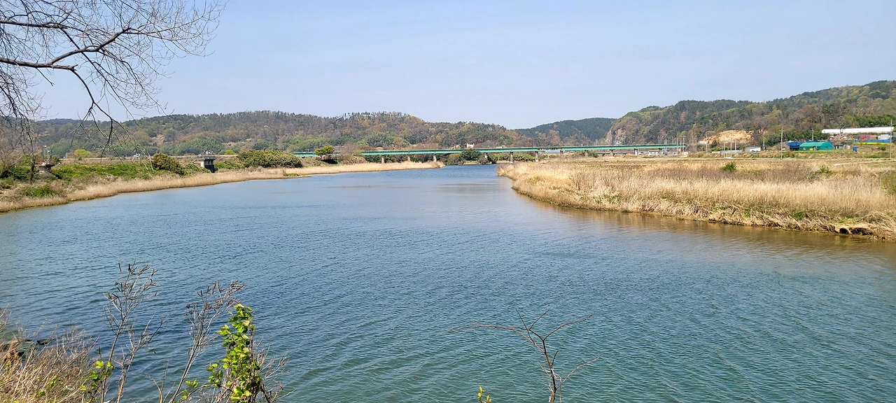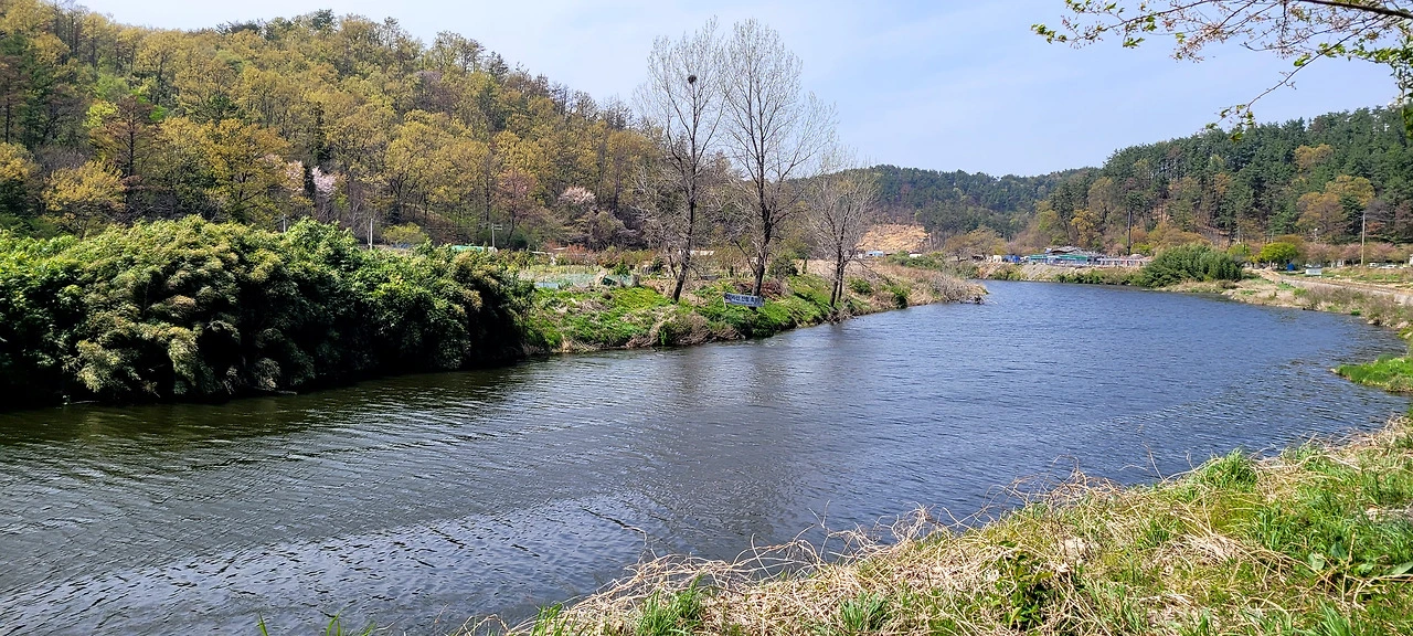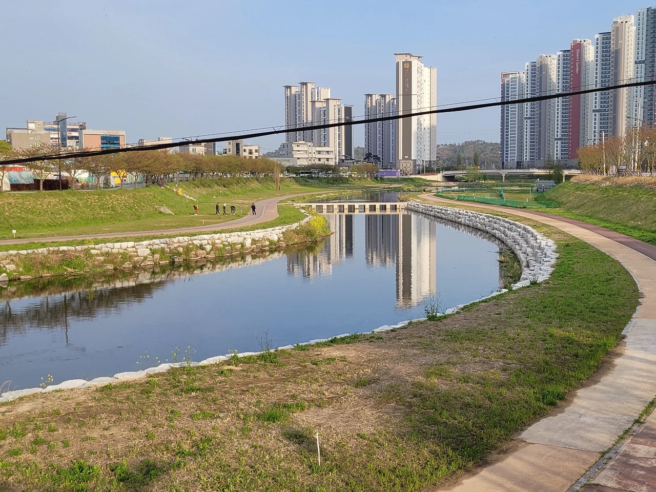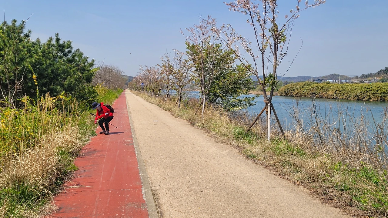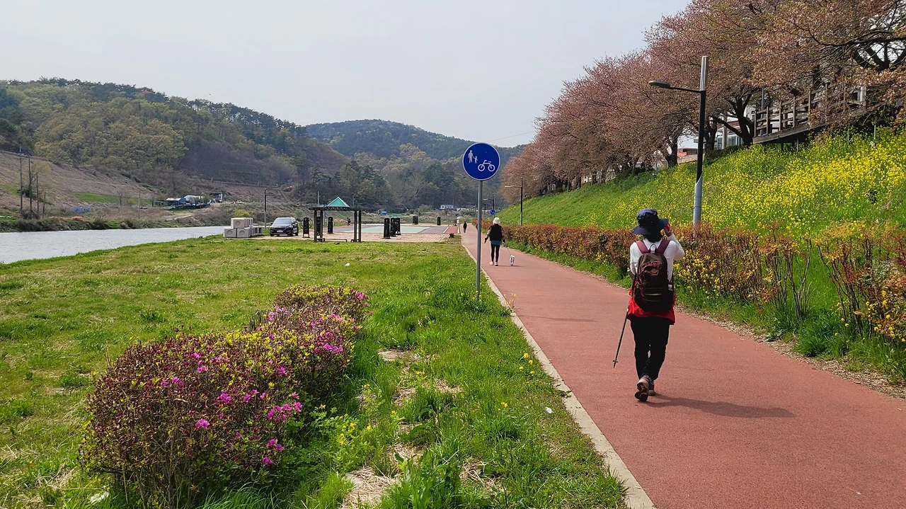 공원을 지나 둔치로 내려선다. 산뜻한 산책길, 운동기구, 쉼터를 갖추고 있다. 둔치에 철쭉이 피어있고, 둑 경사지에는 유채꽃이 바람에 하늘거린다. 둑 위는 벚꽃길이다.
