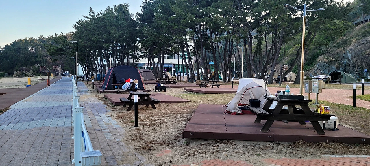 진하해수욕장. '서생면 진하리'인지 '진하면 서생리'인지 헷갈린다. 그만큼 진하해수욕장의 존재감이 돋보인다. 여름철에는 울산 공업단지에 있는 대기업이 앞다투어 하계수련장을 여는 곳이다. 넓은 백사장과 소나무 숲 야영장, 그 사이로 산책 데크가 나란히 간다.