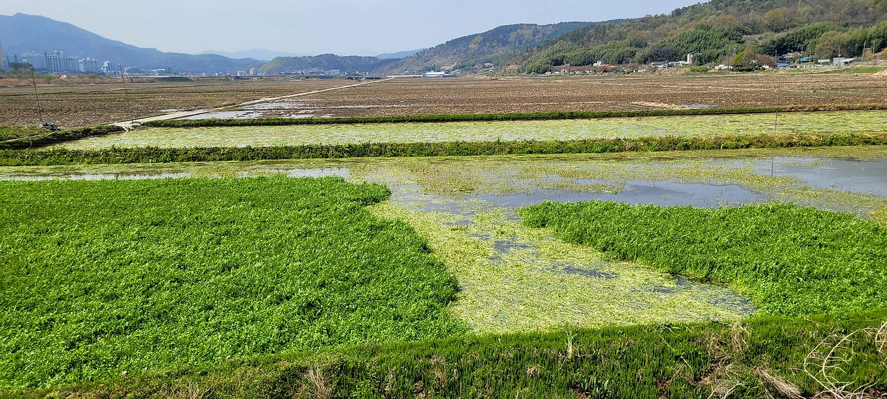 중간중간에 도보여행자를 위한 쉼터가 마련되어 있다. 자전거 여행자도 여럿 만난다. 왼쪽의 제내지(뚝 안 땅)는 들판이다. 미나리밭이 이어진다. 잠시 차도인 온양로를 이용하기도 하지만 다시 둑길을 따라간다.