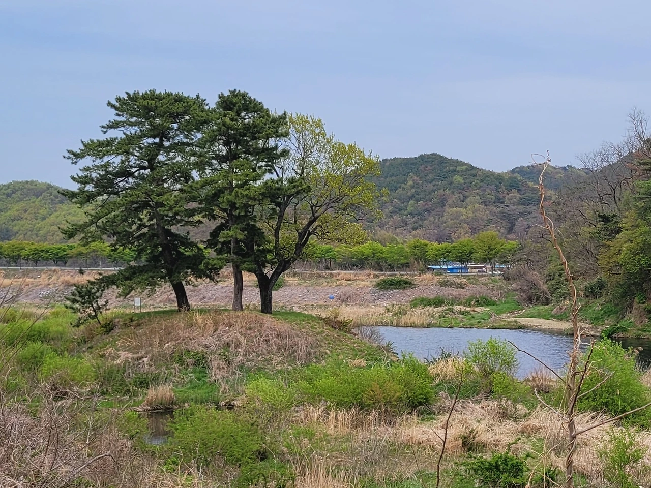돌다리를 건너고, 다시 회야강을 오른쪽에 두고 걷는다. 왼쪽에 온산운동장이 보인다. 그즈음에서 덕신교를 지나간다. 강바닥에 생긴 모래톱 위에 생김새가 수려한 세 그루의 나무가 눈에 들어온다. 추정 수령이 3백 년 가까이 된 곰솔 두 그루와 굴참나무다.