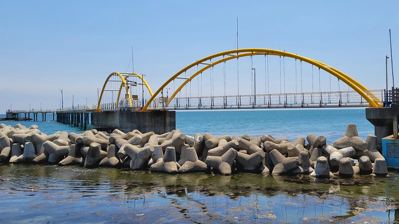 금천교를 지나 용바위길을 따라간다. 용바위와 넘섬을 연결한 긴 다리가 바다로 뻗어 있다. 당사해양낚시공원이다. 다리에 앉아 낚시한다. 일 인당 만 원인 유료 낚시터다. 그냥 돌아보고 나올 수도 있다. 입장료는 천 원이다. 다리 중간쯤 가면 유리 다리다. 바다 위를 걷는 듯한 기분을 느낄 수 있다. 용바위의 용 조형물은 하늘을 오르는 모습을 하고 있다.