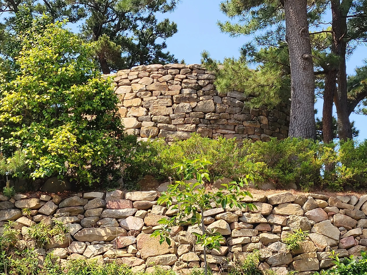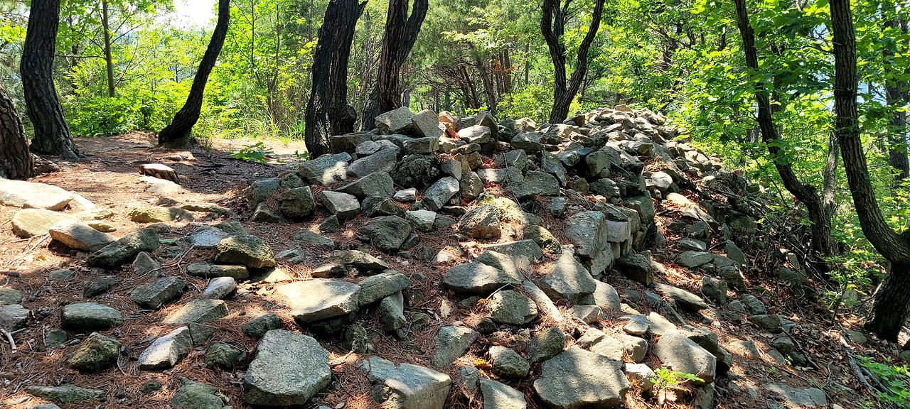 임도가 지나가는 삼거리에 남목관비(碑)가 서 있다. 놀이터와 쉼터도 마련되어 있다. 오른쪽 마성으로 올라가는 오솔길까지 실제는 사거리다. 돌무더기처럼 보이는 것이 마성의 흔적이다. 성 같은 돌담을 상상하다 초라한 흔적에 실망한다.