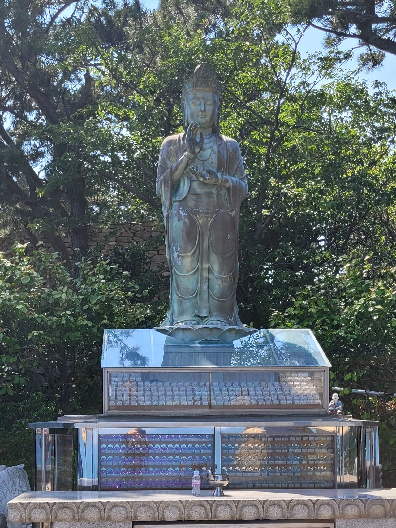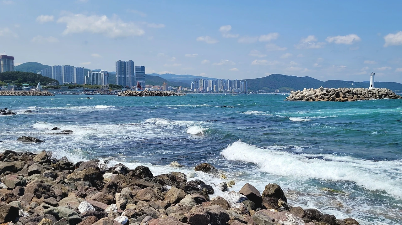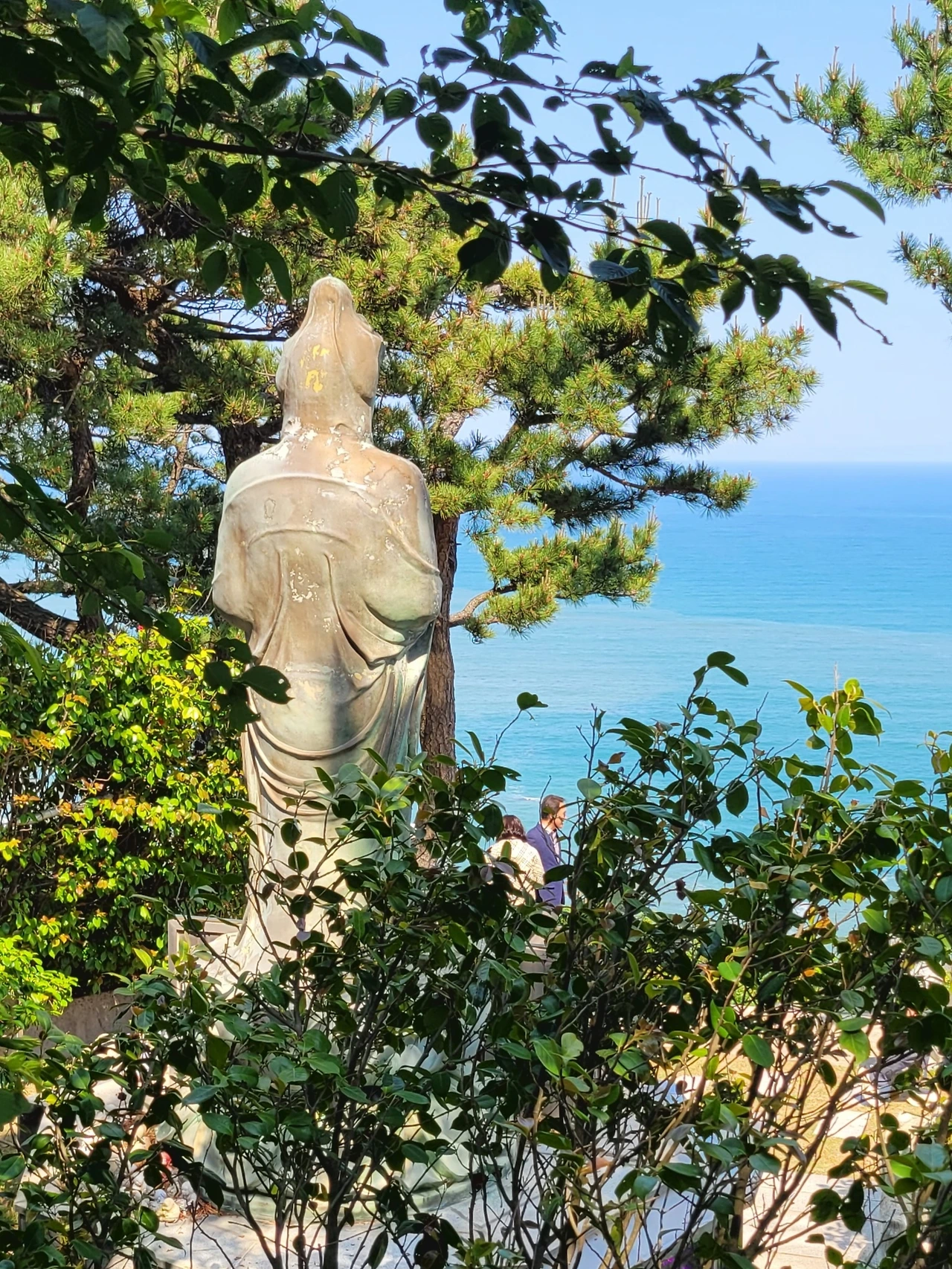 주전봉수대 앞의 계단을 내려선다. 소원을 이루게 해 준다는 해수관음보살이 인자한 모습으로 바다를 내려다본다. 동해바다가 시원하게 펼쳐진다. 왼쪽은 주전항이다. 오른쪽은 멀리 대왕암에서 가까이 현대중공업이 한눈에 들어온다. '말뫼의 눈물'로 화제가 된 골리앗 크레인이 어디 있는지 살펴보지만 여러 기의 크레인 속에 섞여 확인이 안 된다.