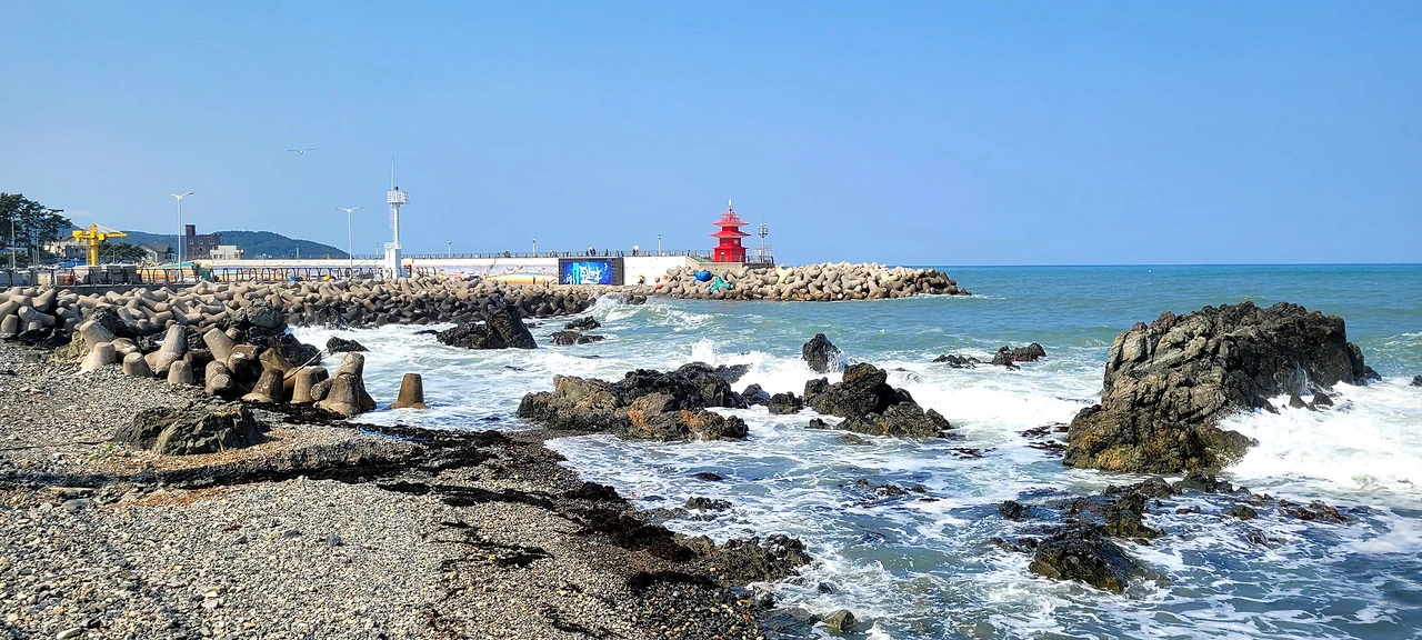 빨간 등탑이 유난히 눈에 띄는 주전항을 지나면 몽돌해변이다.